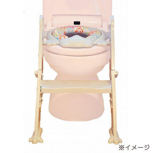 大人用洋式トイレの様に両足をそろえて座らせる事が出来るので、スムーズに大人用トイレへの移行が出来ます。便座のクッション部分もかわいい絵柄でトイレトレーニングが楽しくできます♪