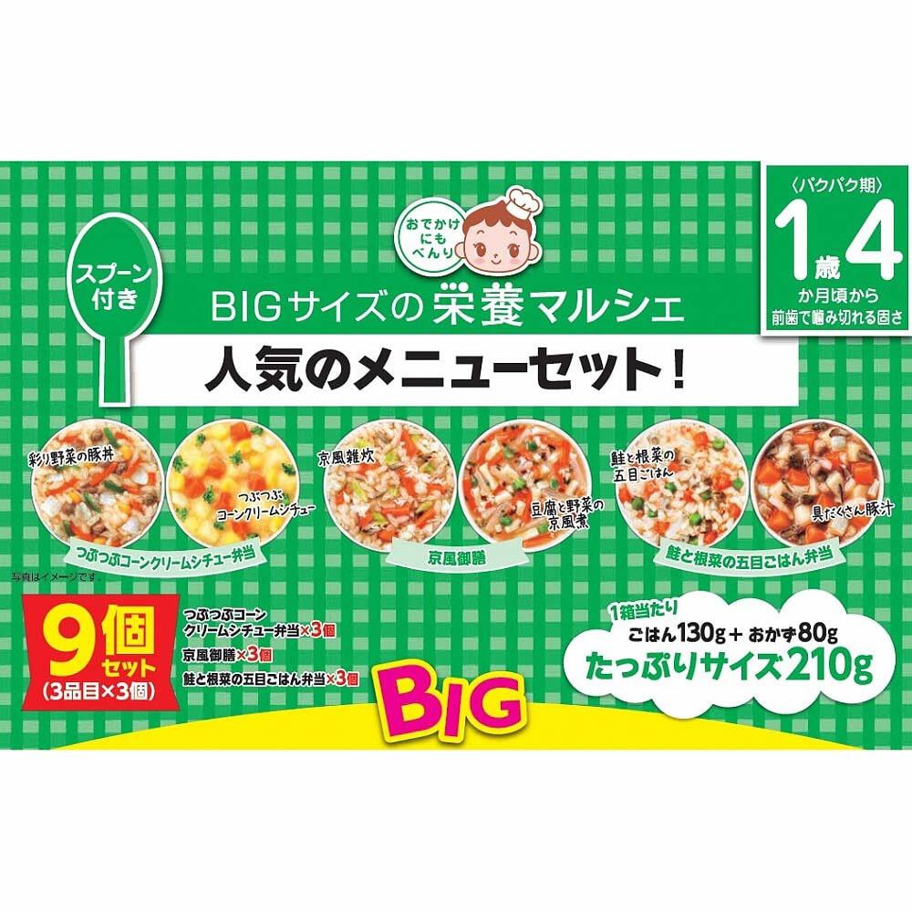 BIg栄養マルシェ16ヶ月品の9個入り詰合せです。つぶつぶコーンクリームシチュー弁当、京風御膳、鮭と根菜の五目ごはん弁当各3個ずつの詰合せです。