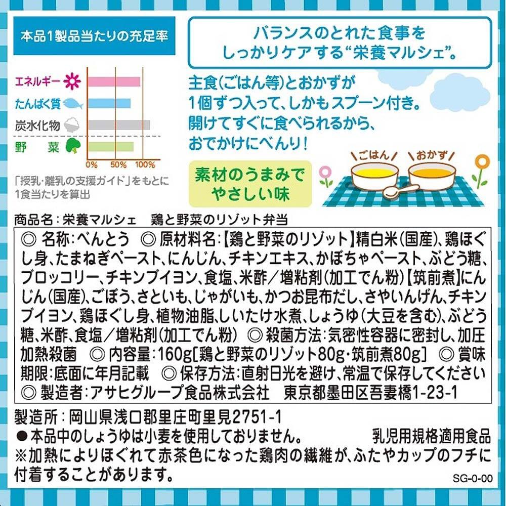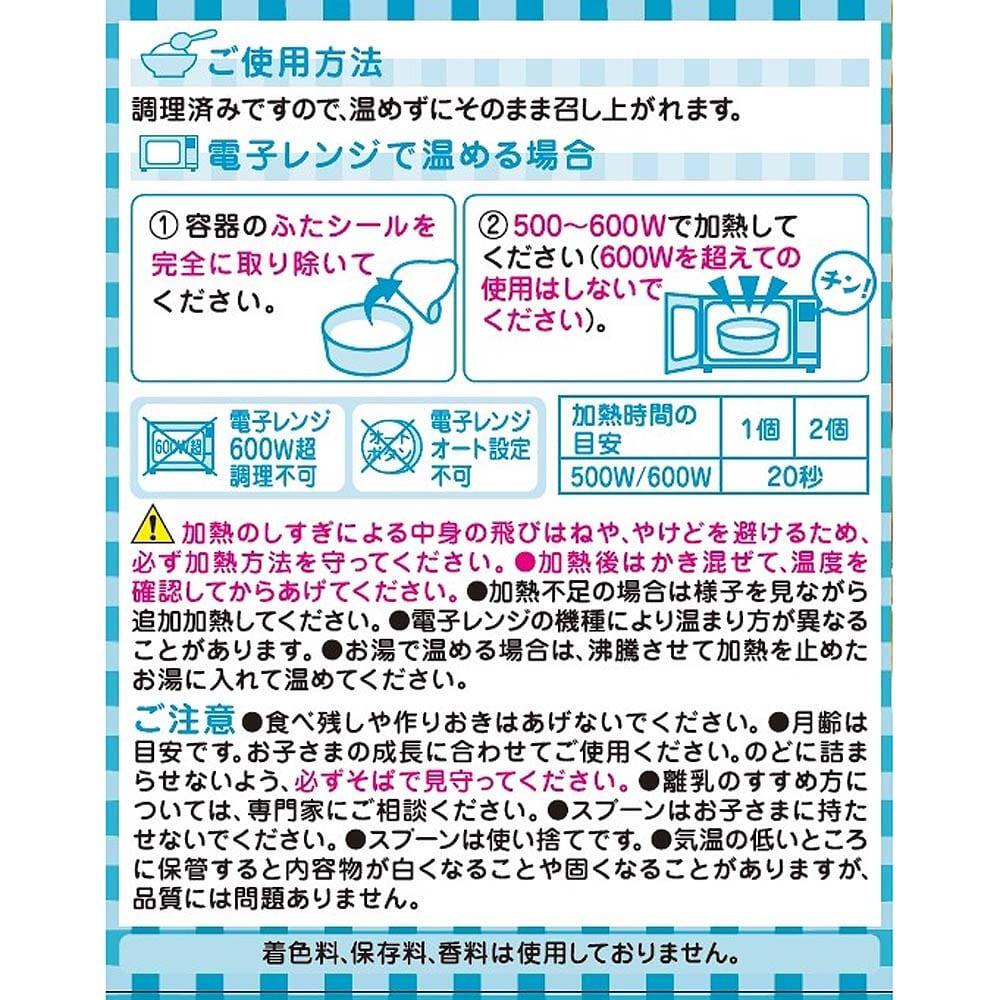 【鶏と野菜のリゾット】精白米(国産)、野菜(たまねぎ、にんじん、かぼちゃ、ブロッコリー)、鶏肉、チキンエキス、ぶどう糖、チキンブイヨン、食塩、米酢/増粘剤(加工でん粉)