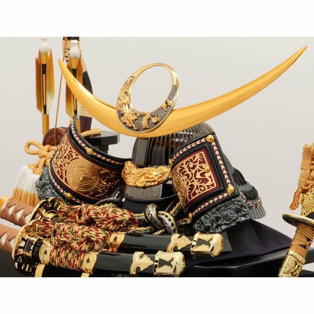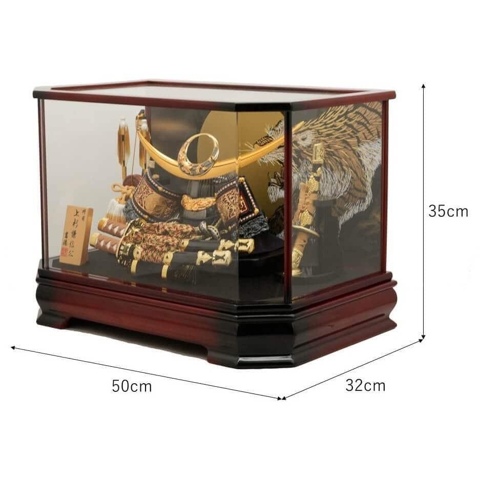 <セット内容>兜1点、ガラスケース1点、弓1点、太刀1点、大小太刀1点、木札1点