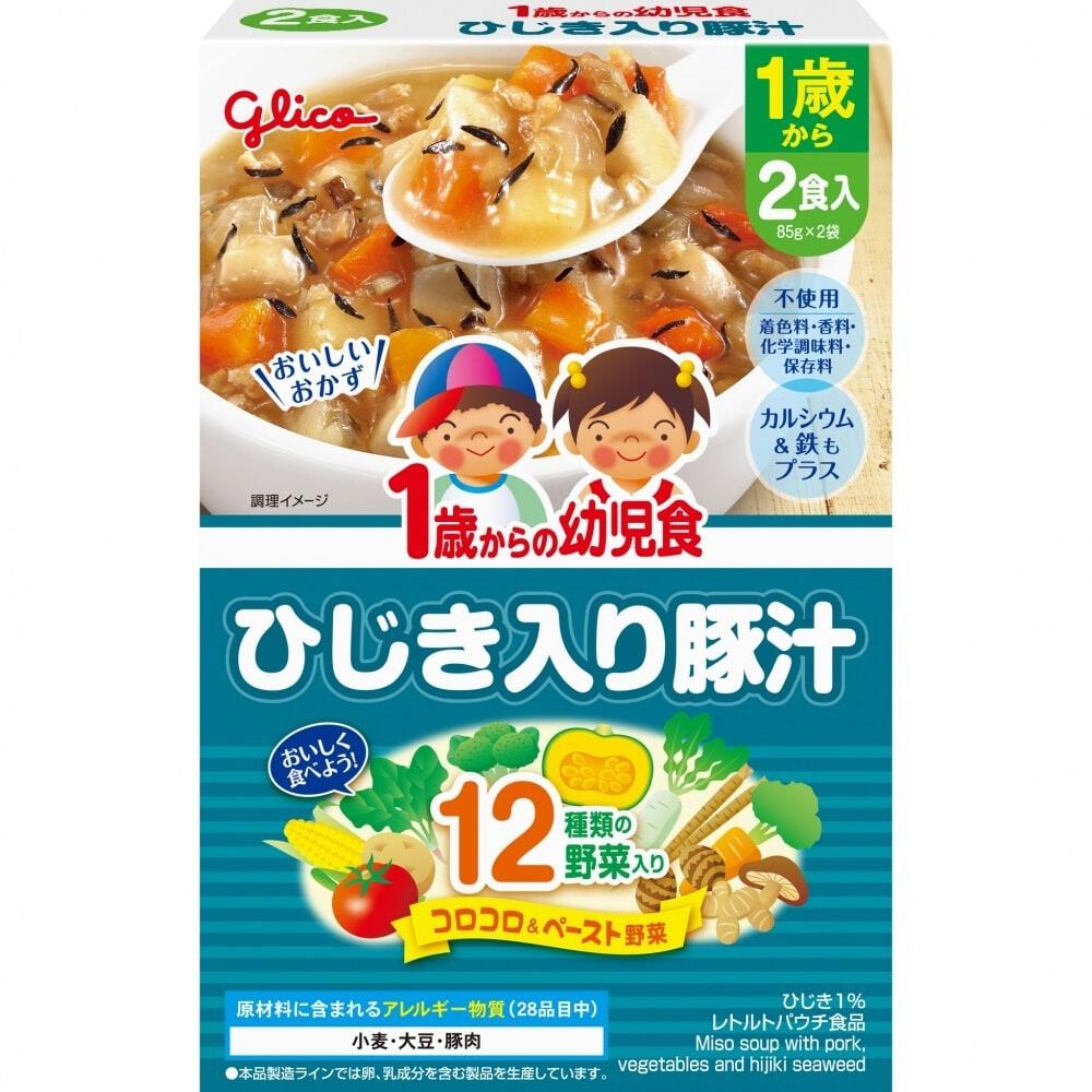 <原材料>野菜(にんじん(国産)、じゃがいも、さといも、だいこん、ごぼう、しいたけ)、豚肉、砂糖、みそ、ひじき、かぼちゃペースト、ポークエキス、かつおエキス、食塩、しょうがペースト、こんぶエキス、ほうれん草ペースト、ブロッコリーペースト、トマトペースト、とうもろこしペースト/増粘剤(加工デンプン)、グルコン酸Ca、ピロリン酸鉄、(一部に小麦・大豆・豚肉を含む)