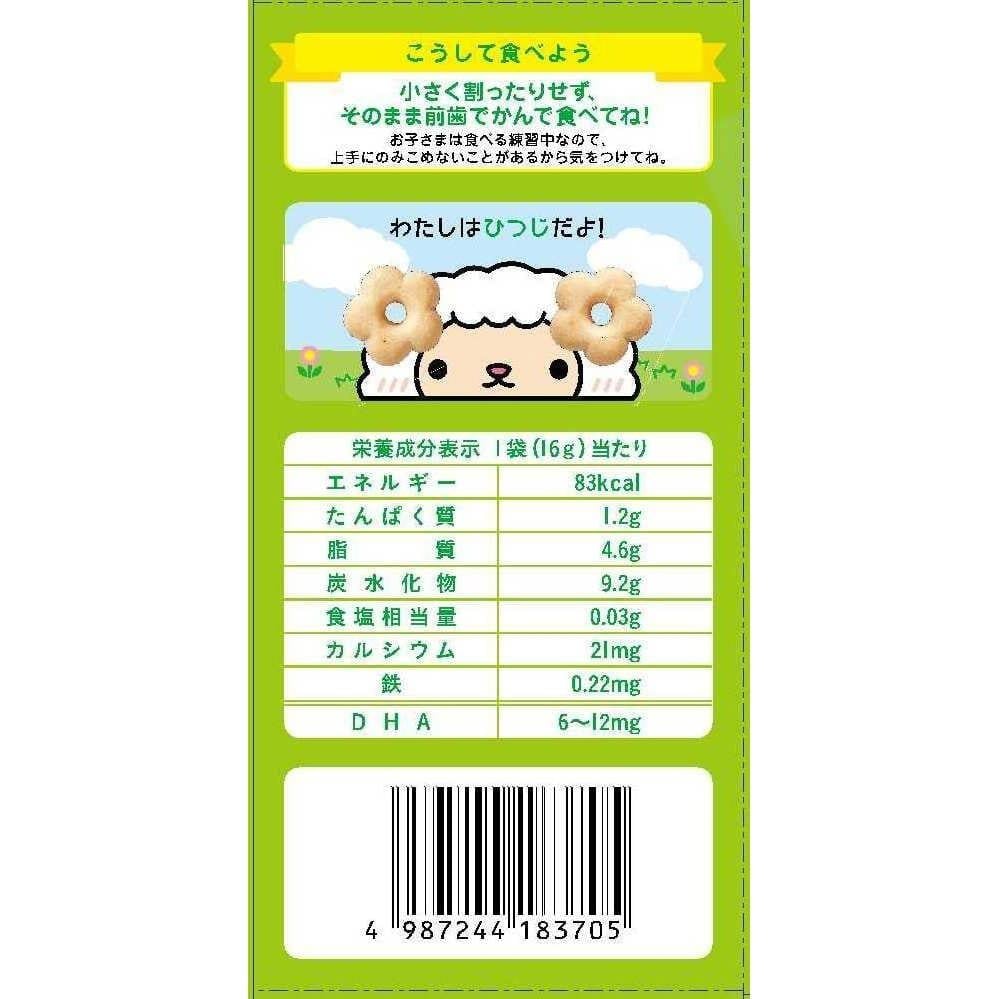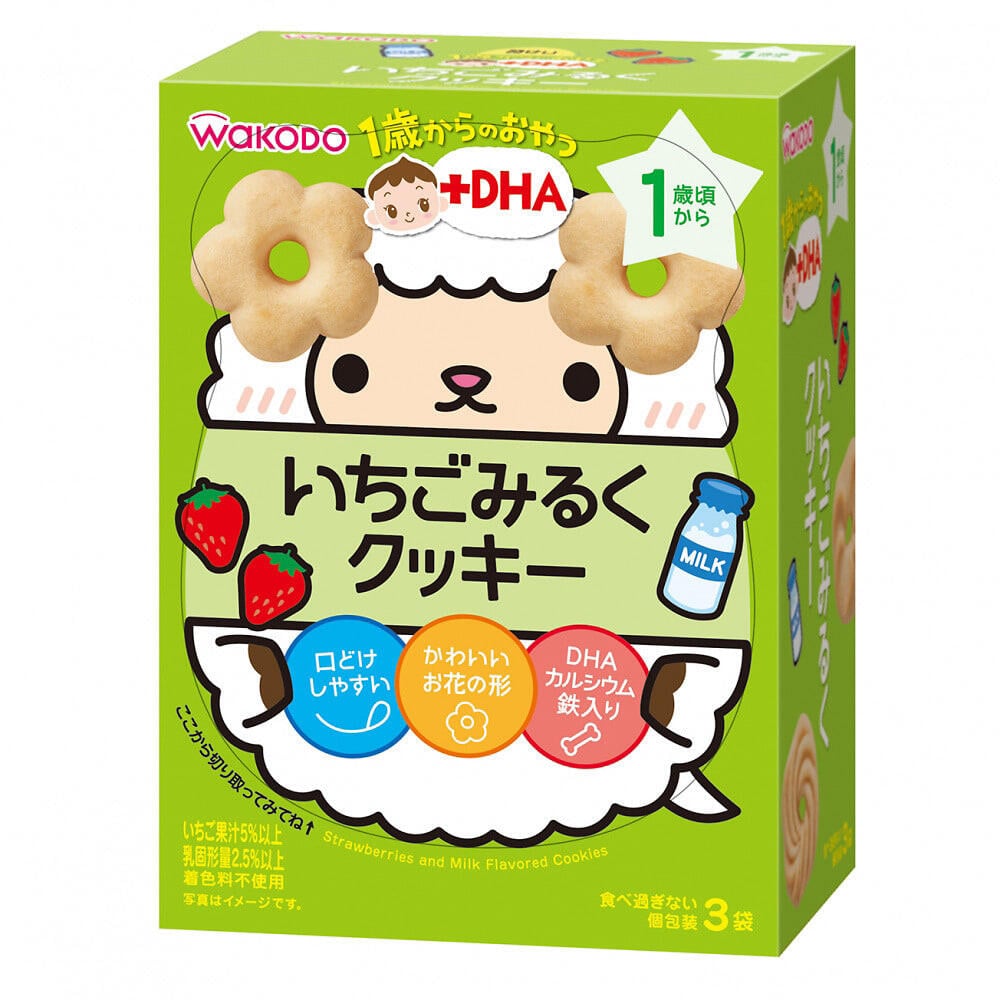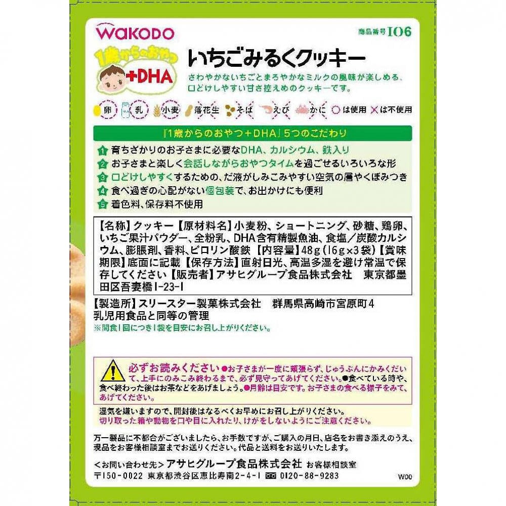 <原材料>小麦粉、ショートニング、砂糖、鶏卵、いちご果汁パウダー、全粉乳、DHA含有精製魚油、食塩/炭酸カルシウム、膨脹剤、香料、ピロリン酸鉄