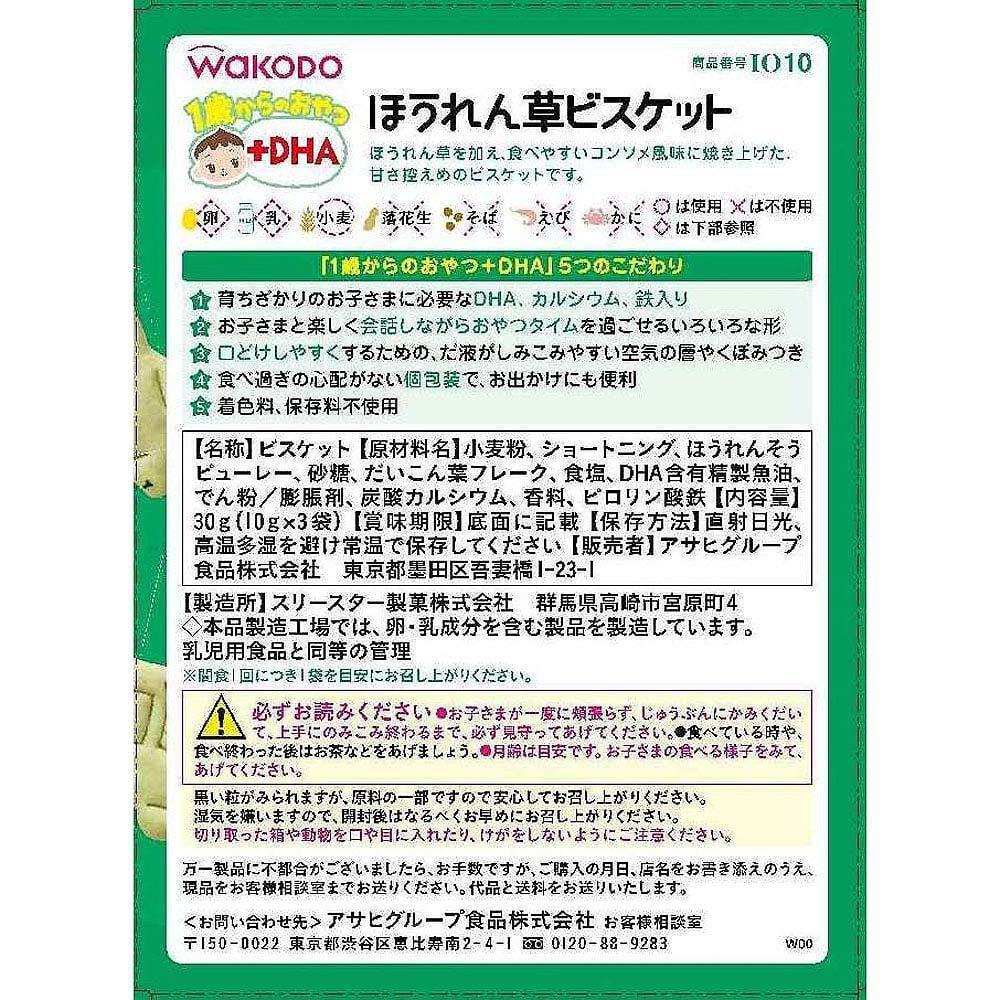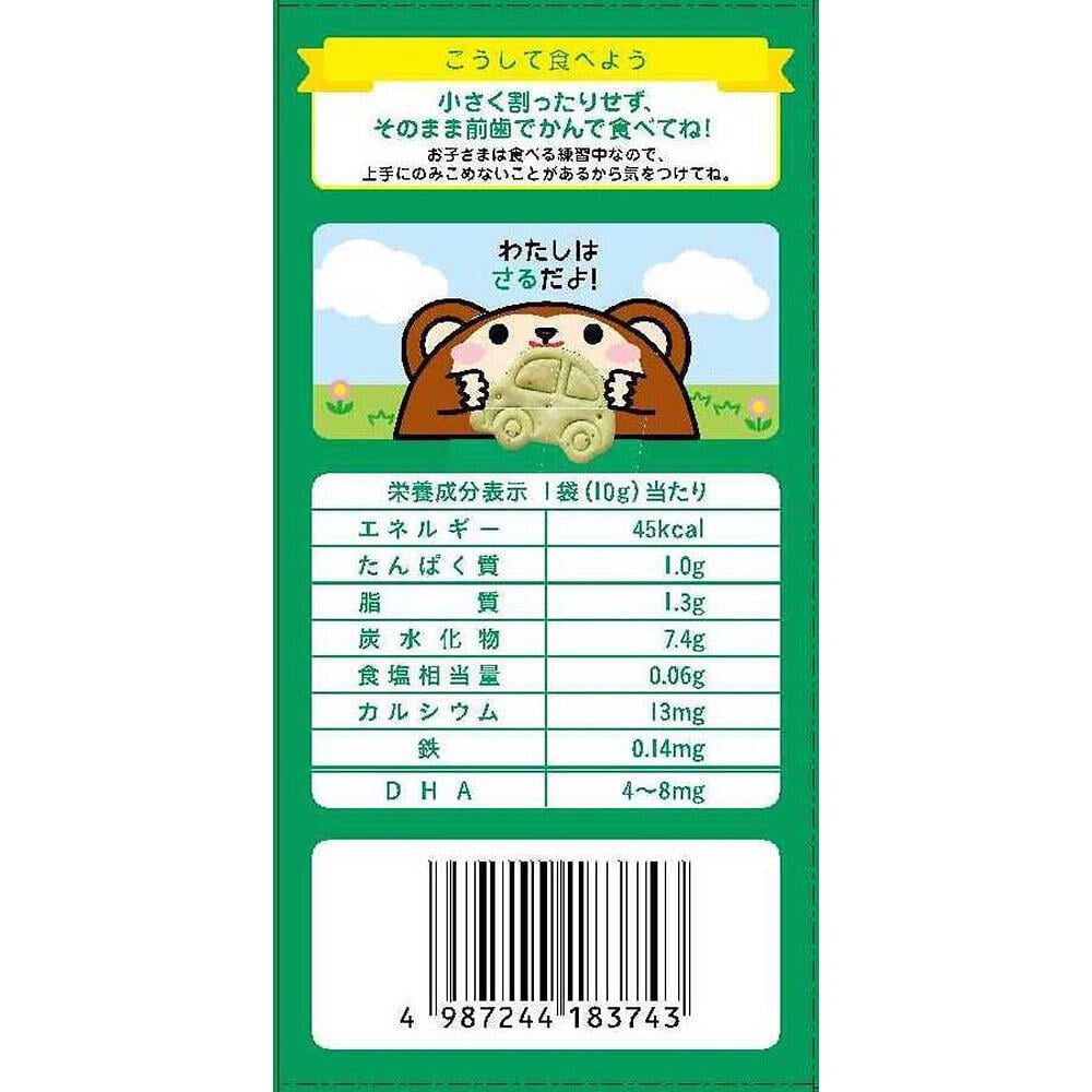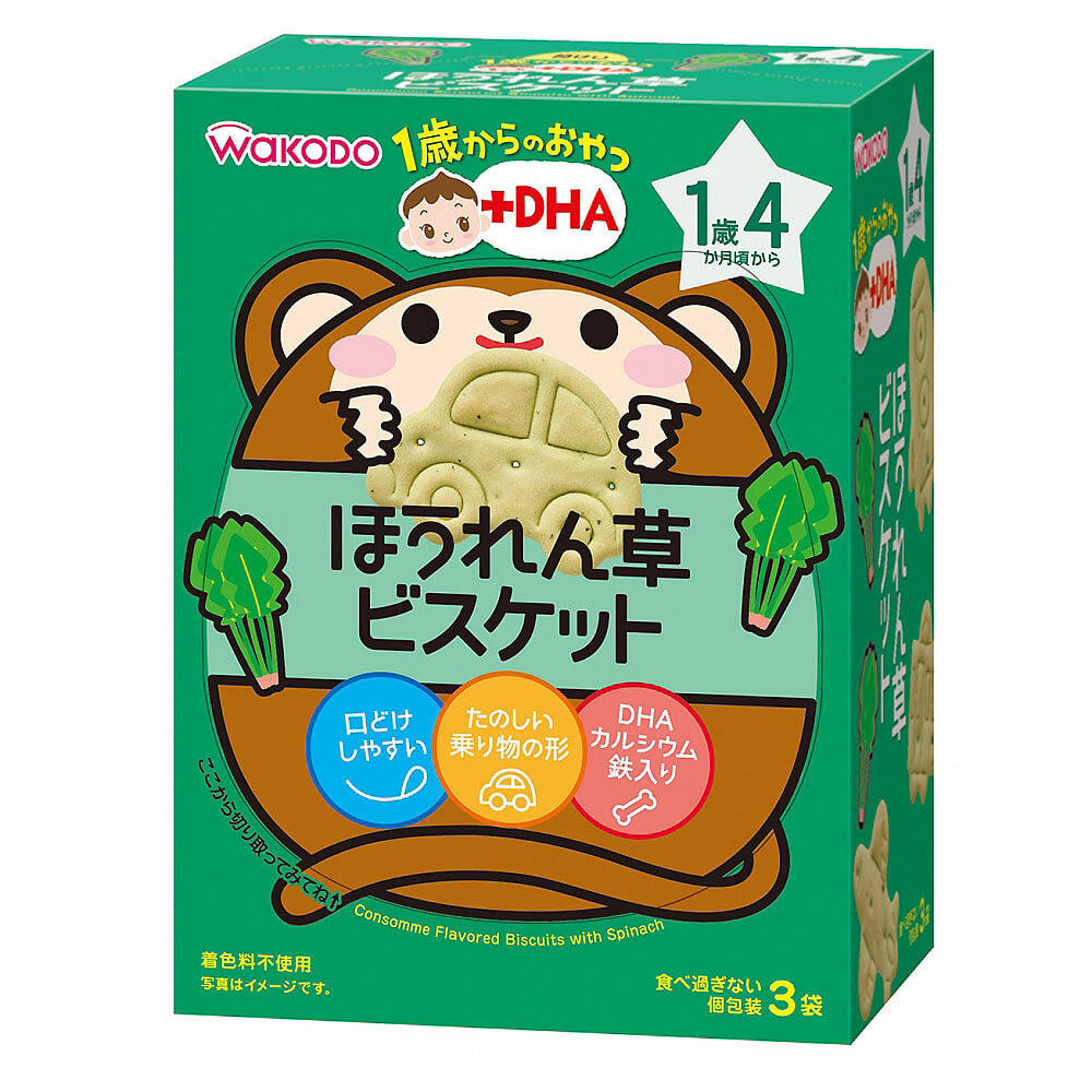 <原材料>小麦粉、ショートニング、ほうれんそうピューレー、砂糖、だいこん葉フレーク、食塩、DHA含有精製魚油、でん粉/膨脹剤、炭酸カルシウム、香料、ピロリン酸鉄