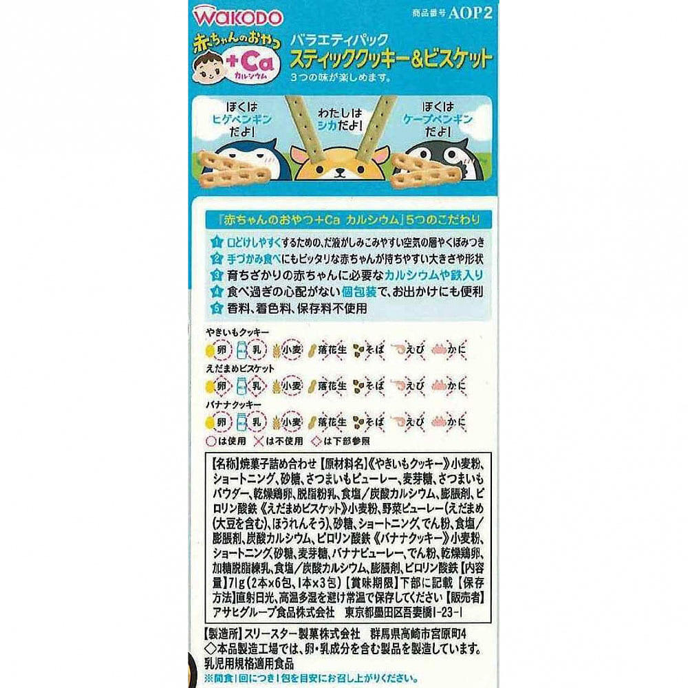 《えだまめビスケット》小麦粉、野菜ピューレー(えだまめ(大豆を含む)、ほうれんそう)、砂糖、ショートニング、でん粉、食塩/膨脹剤、炭酸カルシウム、ピロリン酸鉄