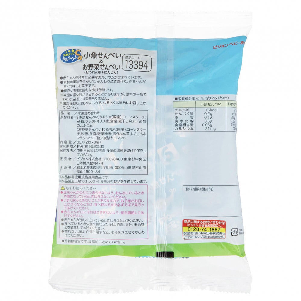 【小魚せんべい】うるち米(国産)、コーンスターチ、砂糖、フラクトオリゴ糖、食塩、煮干し粉末/炭酸カルシウム