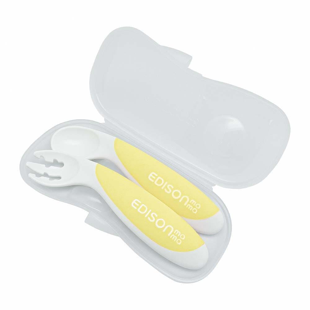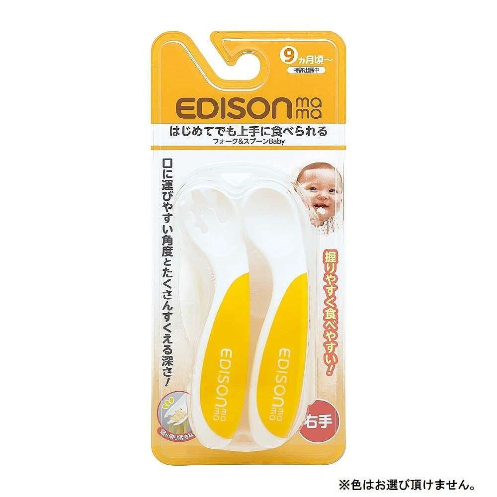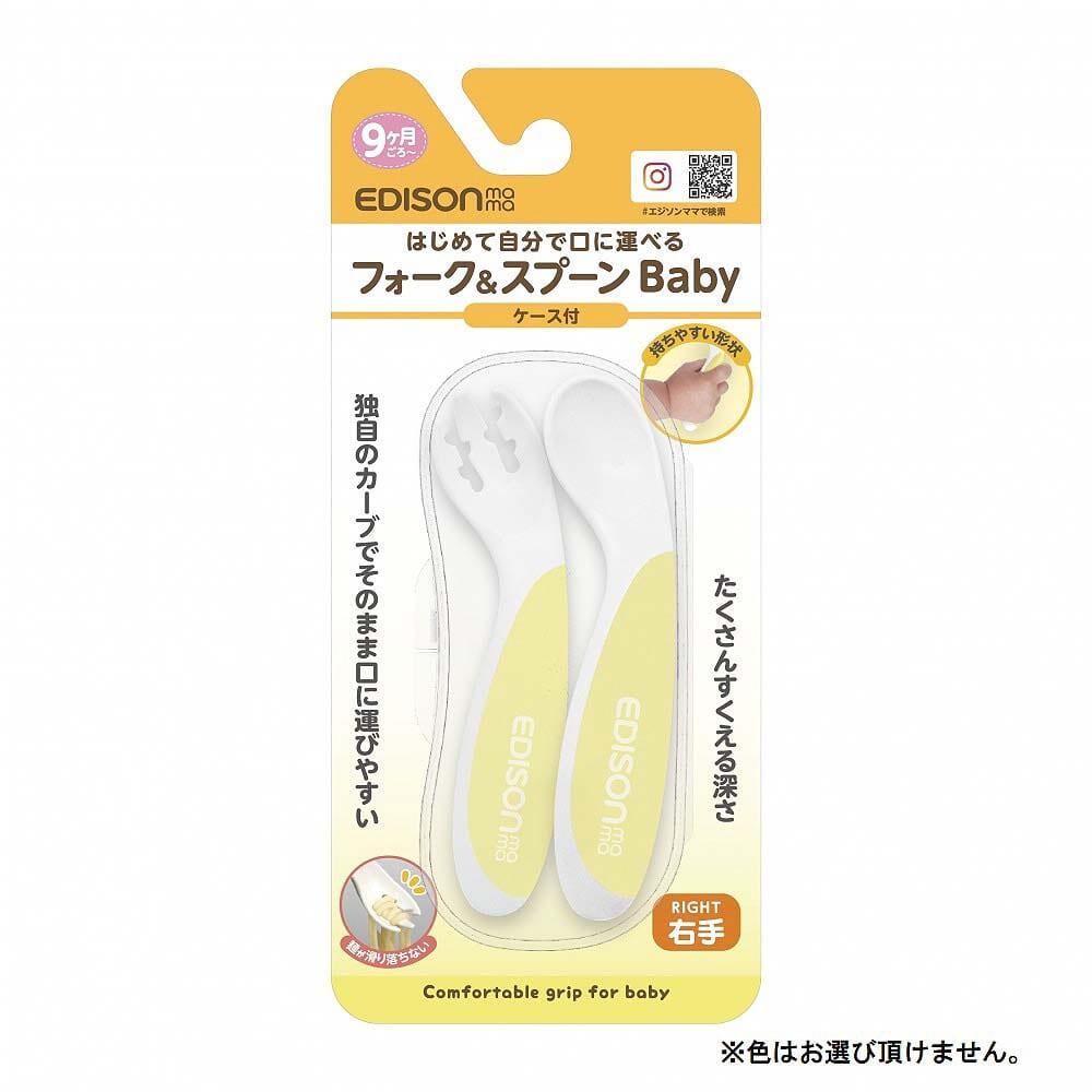 ※いずれか一つの発送となります。※色はお選び頂けません。はじめてでもじょうずに食べられる!!ベビーのために作られたエジソンママのフォーク&スプーンBabyお口にまっすぐ運べる2つの角度で、手首をうまく動かせないベビーでもじょうずに食べられます。手にフィットする取っ手はベビーの手にも握りやすく、ラバー素材で滑りを防止します。持ち運びに便利なケース付です。■ベビーのための2つの角度赤ちゃんのために作られたフォーク&スプーンBabyは、はじめてでもひとりで食べられる工夫がいっぱい。乳幼児期のお子様は手首をうまく動かすことができません。食べたいのに口からずれてしまったり、運ぶ最中にこぼれてしまうことも。フォーク&スプーンBabyは、手首を返さなくても自然と口に運べる角度を研究しました。ちょうどいい角度ではじめてでもじょうずに食べられます。■ママパパも食べさせやすい自分でやりたい!と頑張っているベビーでも、練習段階の頃はママパパが食べさせてあげることも多いはず。手前でも、隣に座っていても食べさせやすい形状です。■商品特徴1)独自の溝がついたフォーク溝がついているので、すべりやすい麺類や食材を絡めてキャッチします。2)こぼれにくい深いスプーン深めのスプーンは食材をすくいやすく、こぼさずに口まで運べます。3)握りやすい取っ手太くて丸い非対称の取っ手は、どんな角度でも握りやすい形状を極めています。ラバー素材に滑りにくく仕上げました。<セット内容>フォーク、スプーン、ケース<主な材質>本体:ポリプロピレン、熱可塑性エストラマー(耐熱温度/140℃) ケース:ポリプロピレン(耐熱温度/110℃)