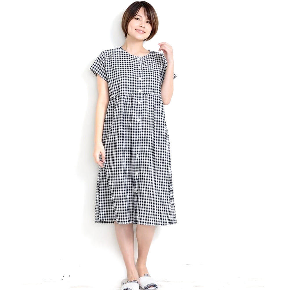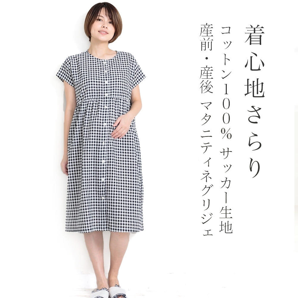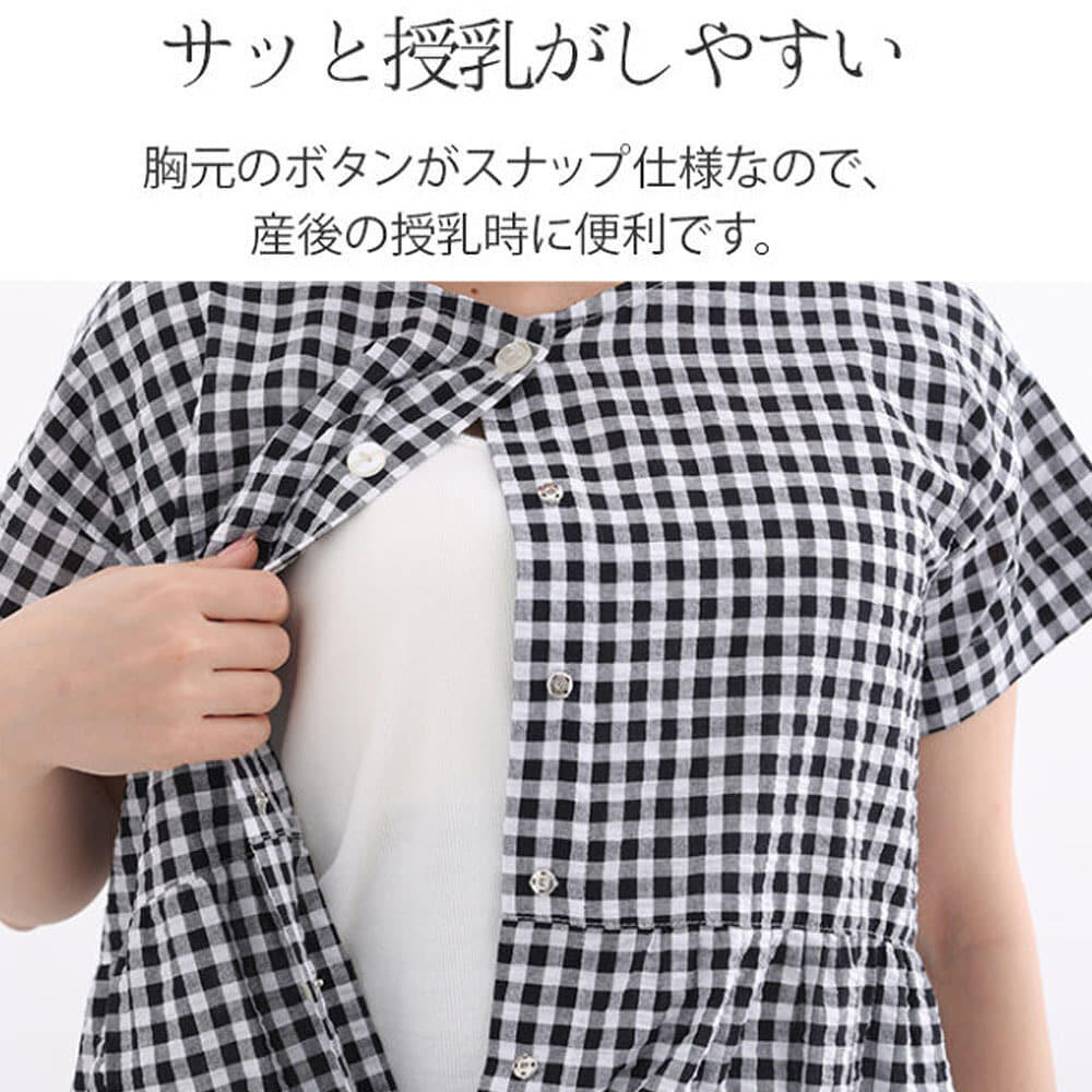 マタニティ 半袖ルームワンピース サッカーギンガム ブラック×M-L