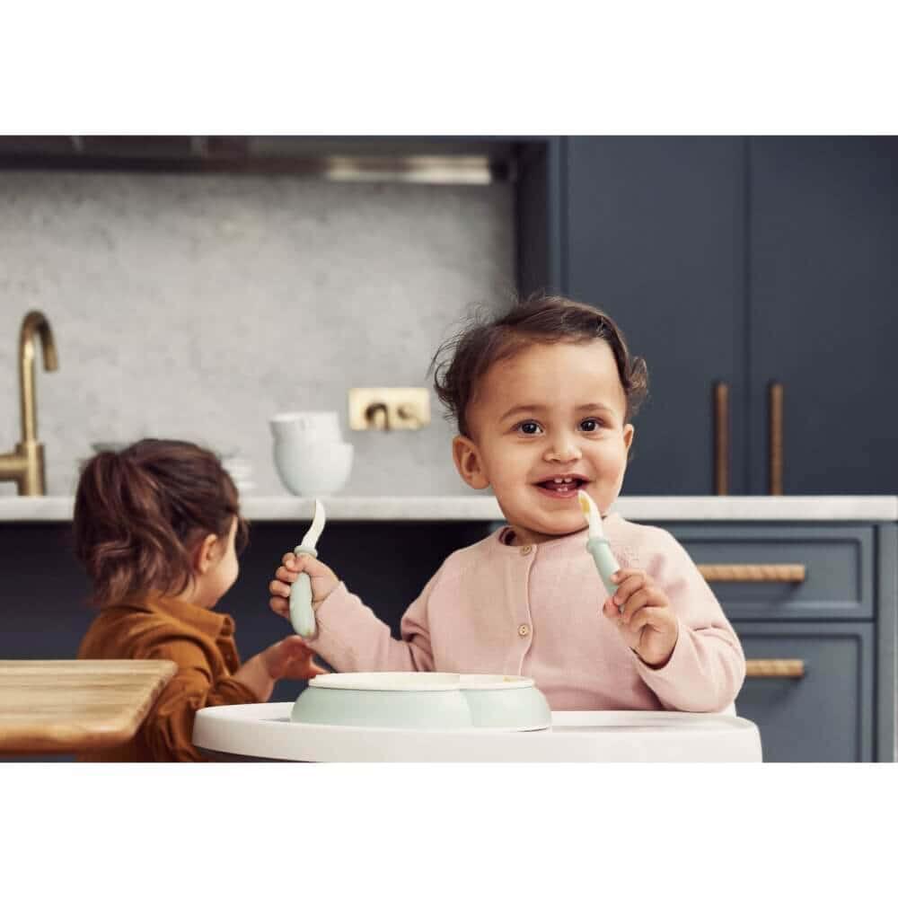 ベビースプーンとフォークは、お子様の小さな手が握りやすい短いグリップが特徴。