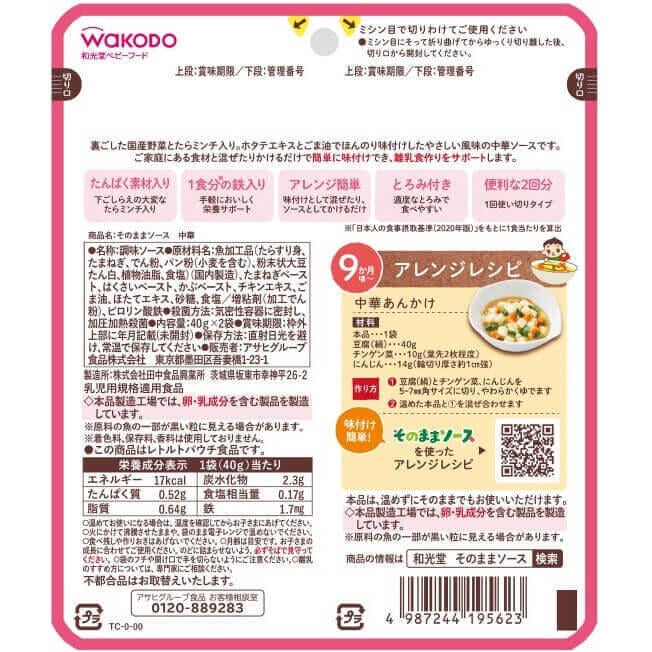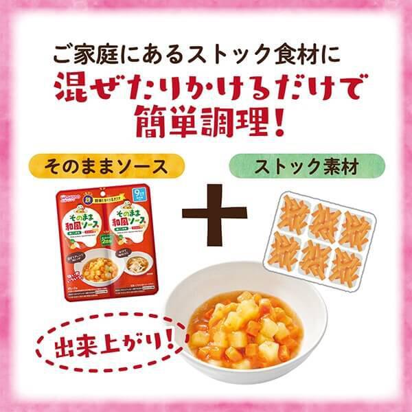 ご家庭にある食材と混ぜたりかけるだけで、お子さまのおかずの味付けが簡単にできる、国産裏ごし野菜とたらミンチ入りのお子さま向け調味用ソースです。1食分の鉄入り。