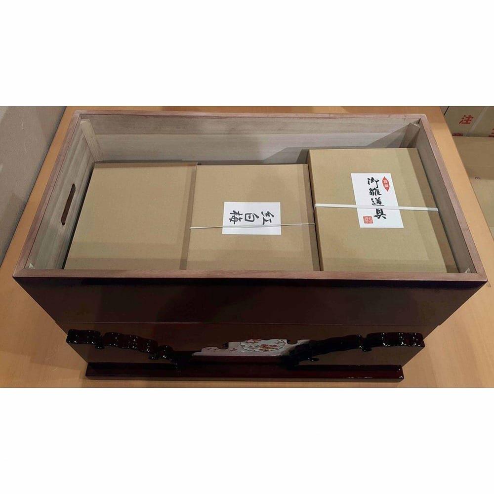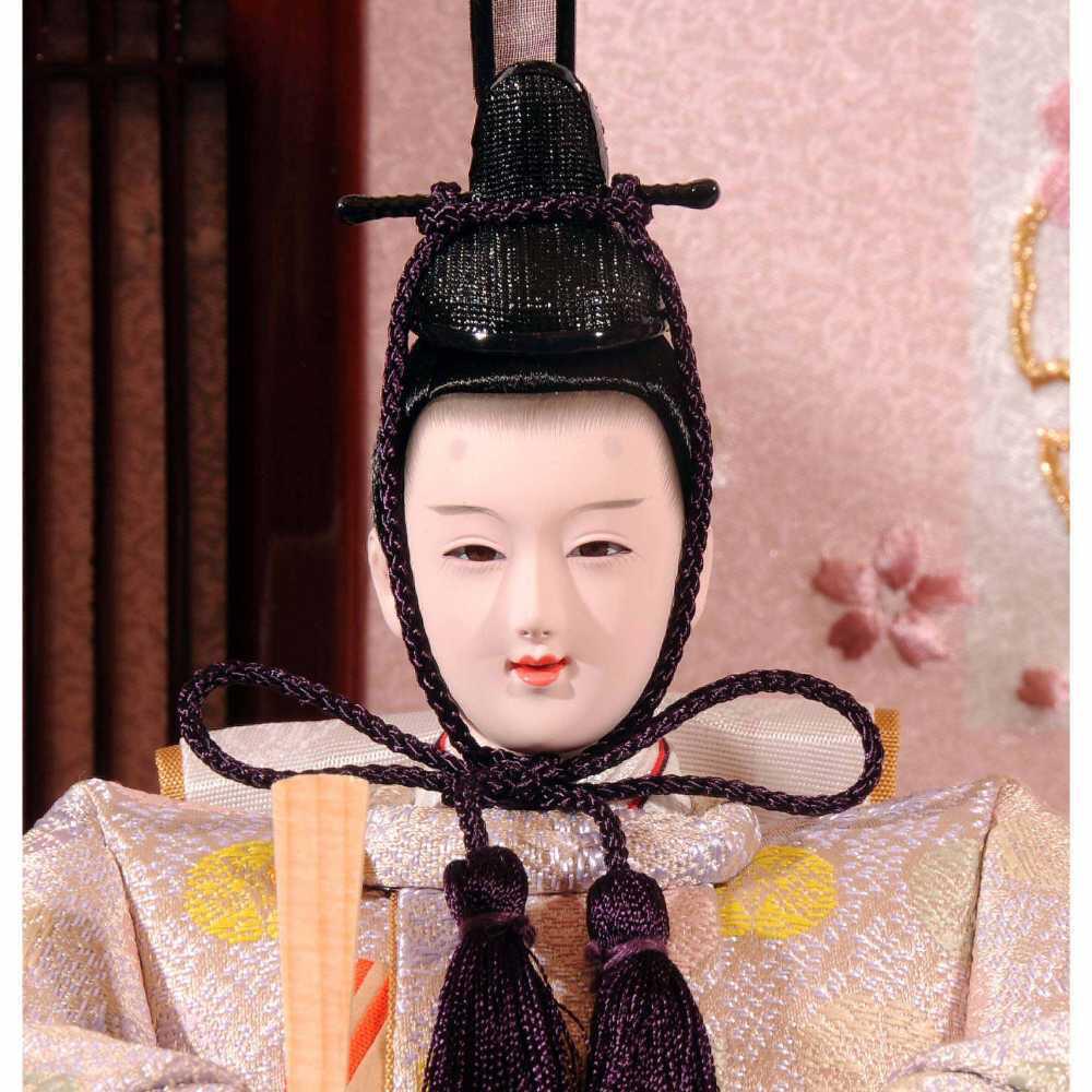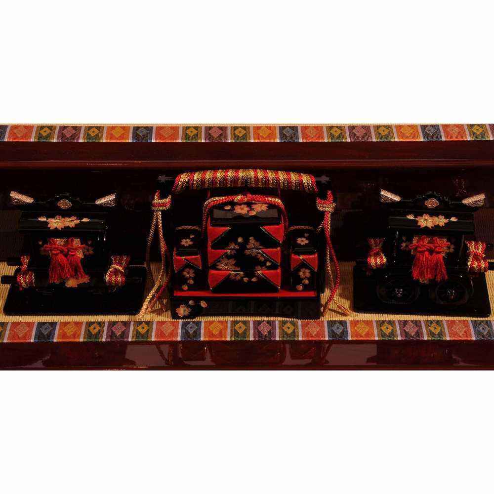 豪華でボリュームのある三段収納五人飾りです。収納箱は引き出し式で簡単に設置することができ、コンパクトに収納可能です。収納箱には伝統文様の雪輪(六角の結晶の輪郭をまるくかたどって図案化したもの)のデザインを打ち抜き、屏風と幕板に雪輪と桜の刺繍を施しました。職人技の光る一揃いです。