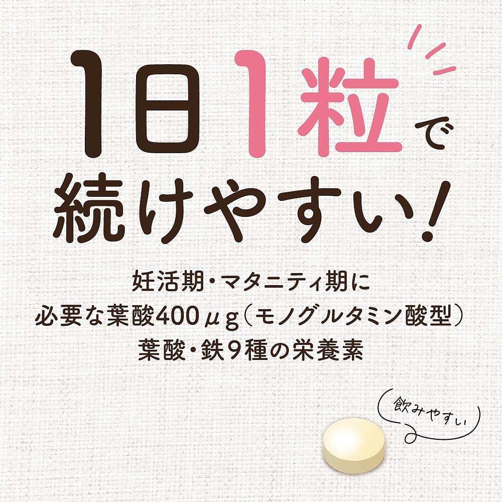 不足しがちな鉄や合計9種のビタミン、ミネラル配合。1日1粒で済み、小さめ粒なので、つわりの時期でも飲みやすく、長期間続けやすい。