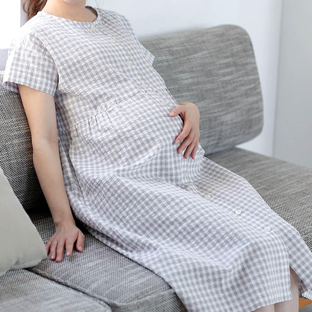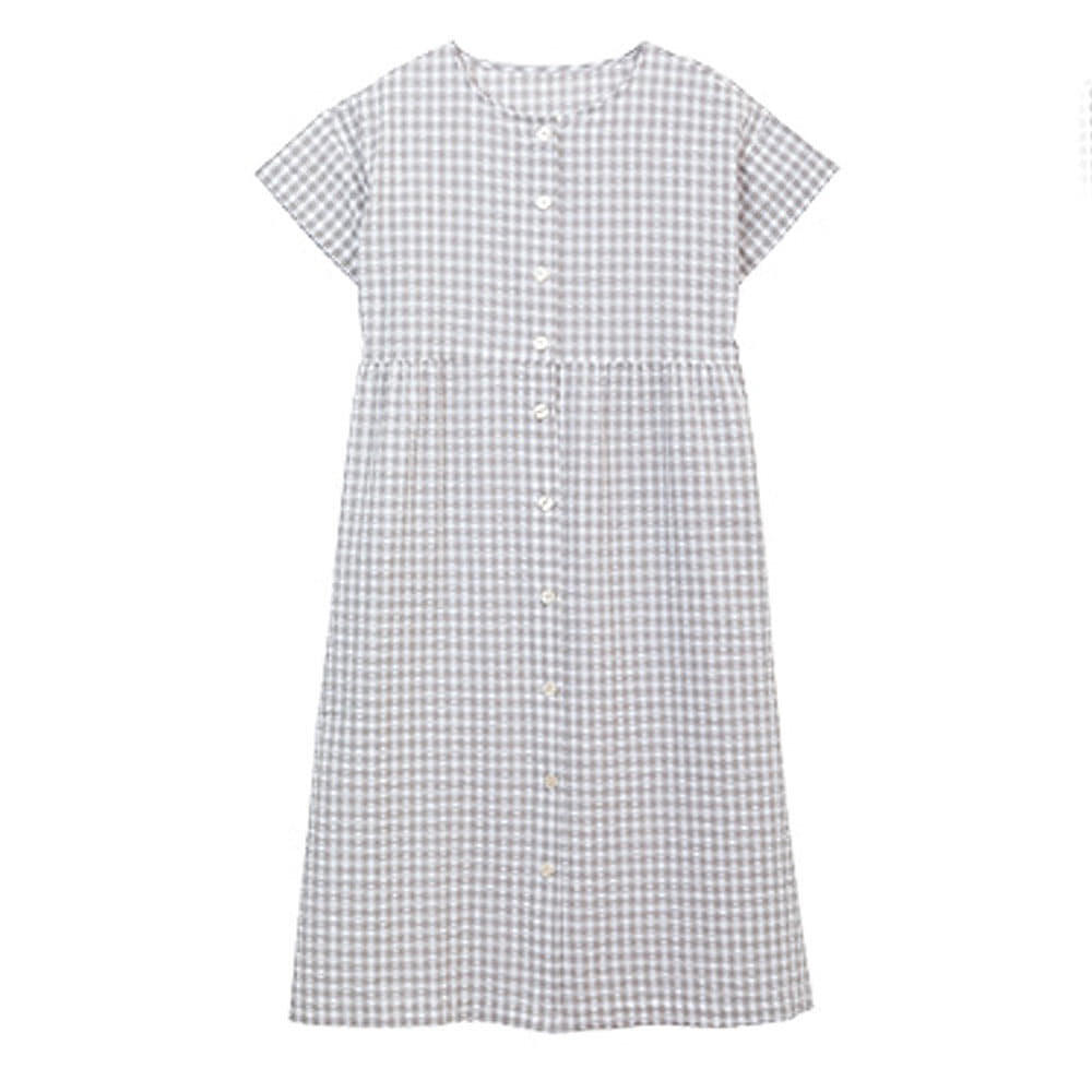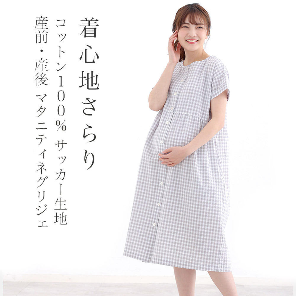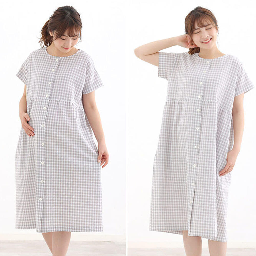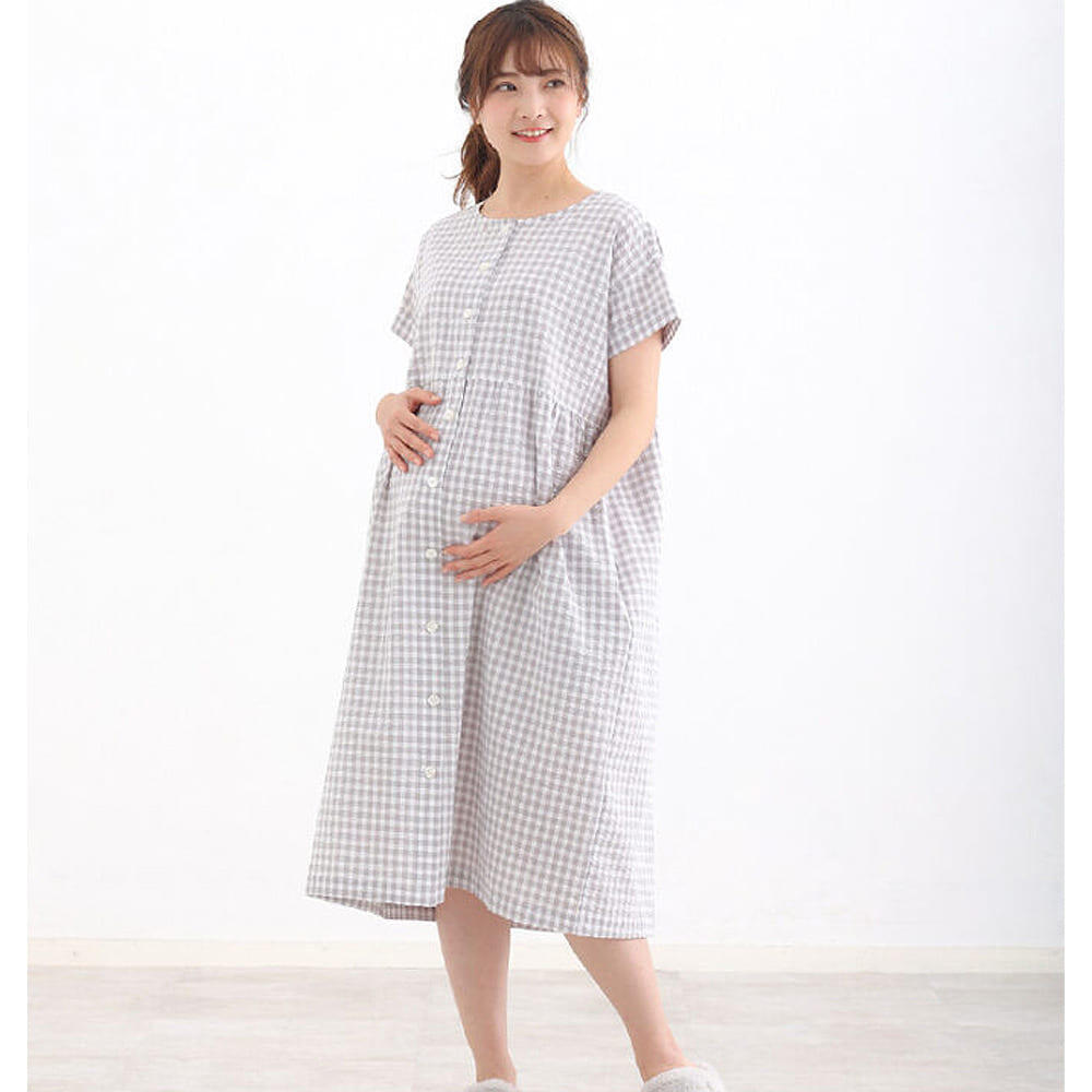 マタニティ 半袖ルームワンピース サッカーギンガム グレー M-L