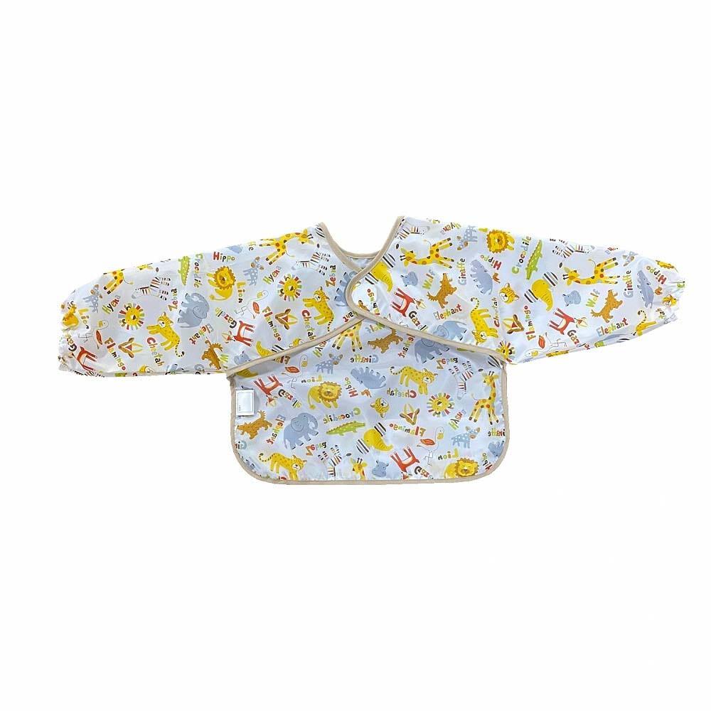 耐久はっ水加工素材を使用したエプロンで、お子様のお洋服も汚れにくく、また洗濯しても乾きやすく肌触りもさらりとしたドライ感覚で、ビニールの様なゴワゴワ感がありません。食べこぼしても大丈夫!これでママも安心です。長袖タイプはお袖の汚れを手首までカバーし便利。ワイドで着やせ易くお子様も嫌がりません。柔らかい生地なのでくるくると小さくたためて持ち運びに便利です。首もとは面ファスナーを使用しワンタッチで簡単に着脱できます。(ワンタッチテープの角は丸くカットしてますのでお子様に安心です)