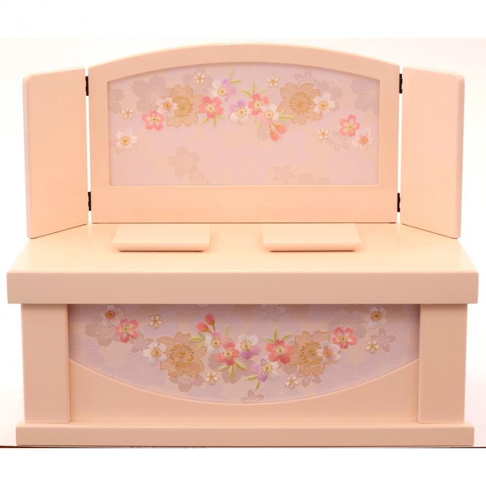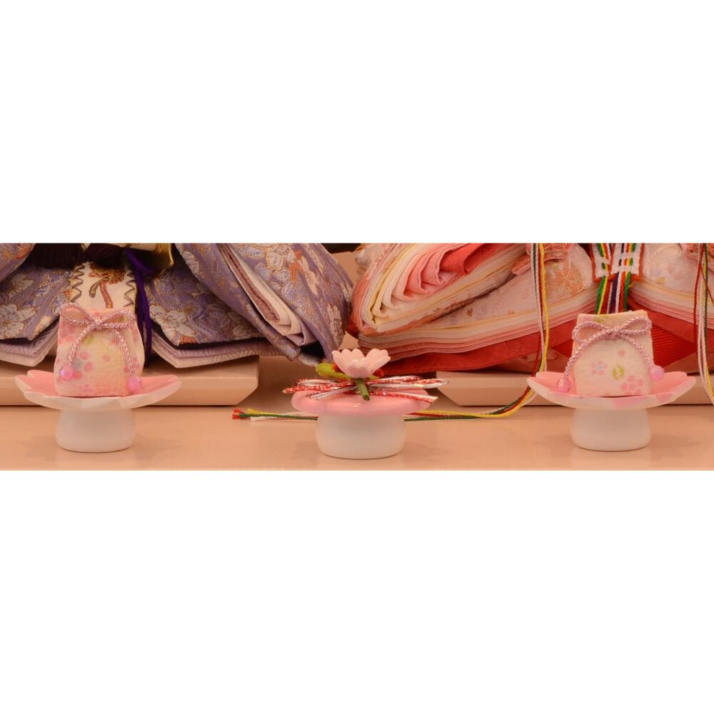 随所に桜を施した華やかで春らしい親王収納飾りです。淡い色合いの衣装のお人形を配し、優しいピンク色の飾り台と屏風には桜の刺繍を施しました。