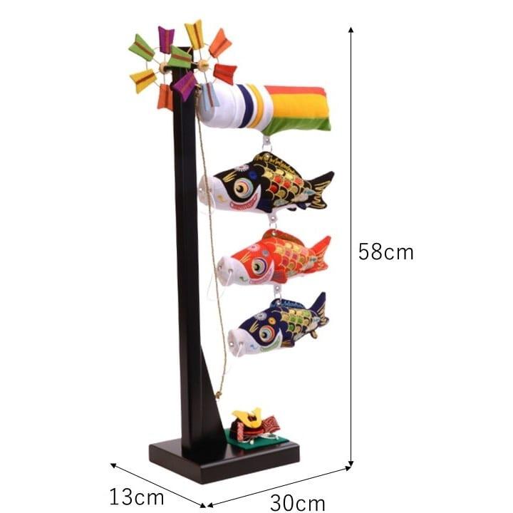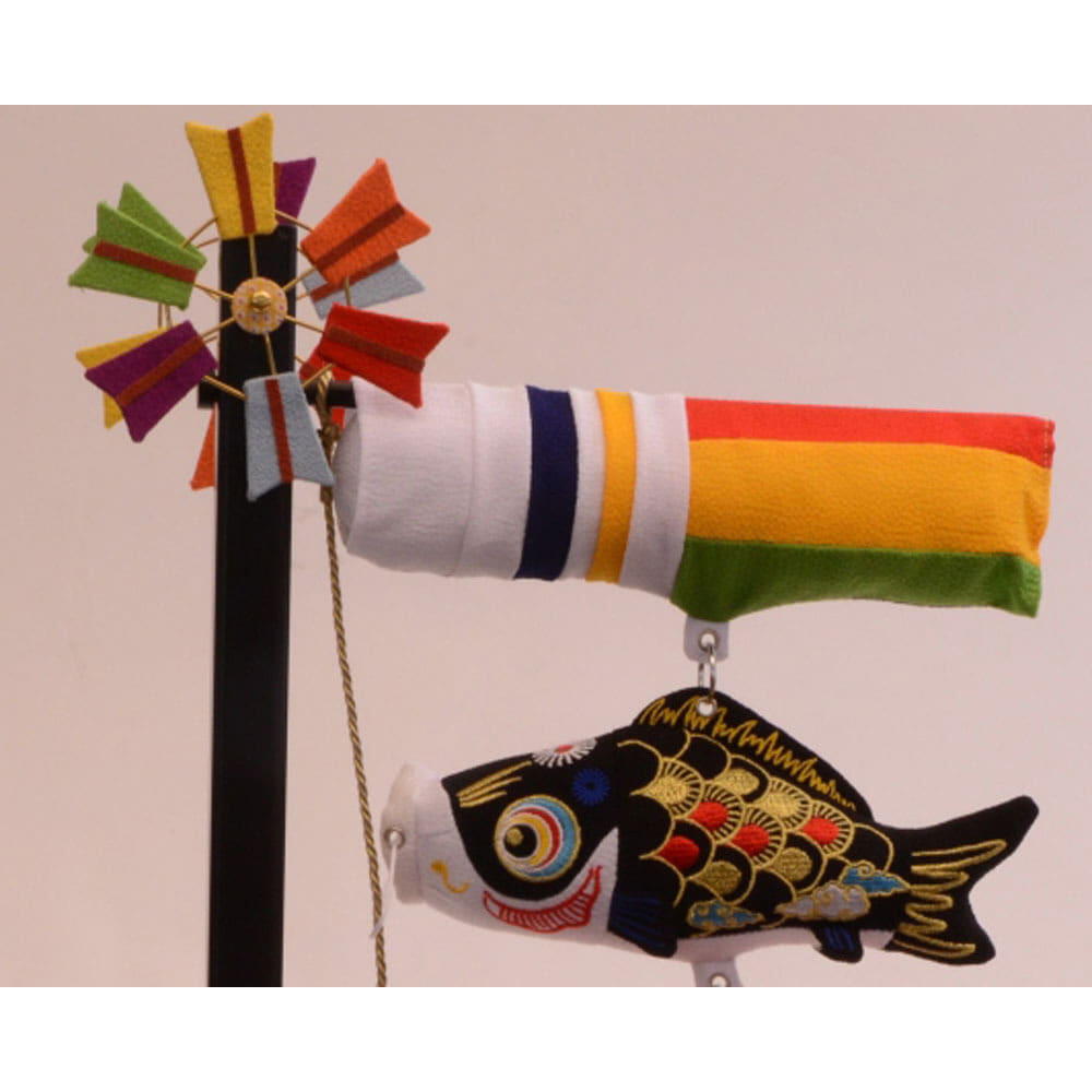 <セット内容>吹き流し1点・鯉3点(黒鯉・赤鯉・青鯉)・兜1点・飾り用スタンド(組み立て式)1点