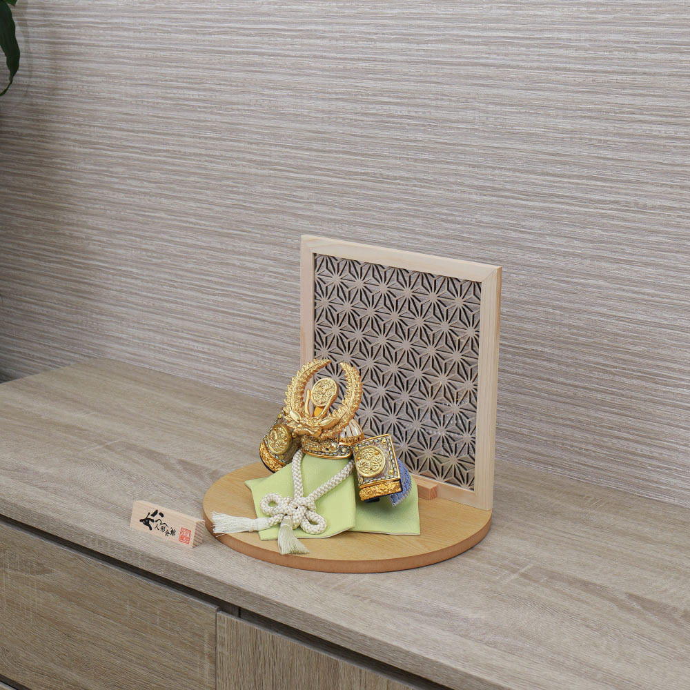 間口28cmと、場所を選ばずお飾り出来る兜セットです。