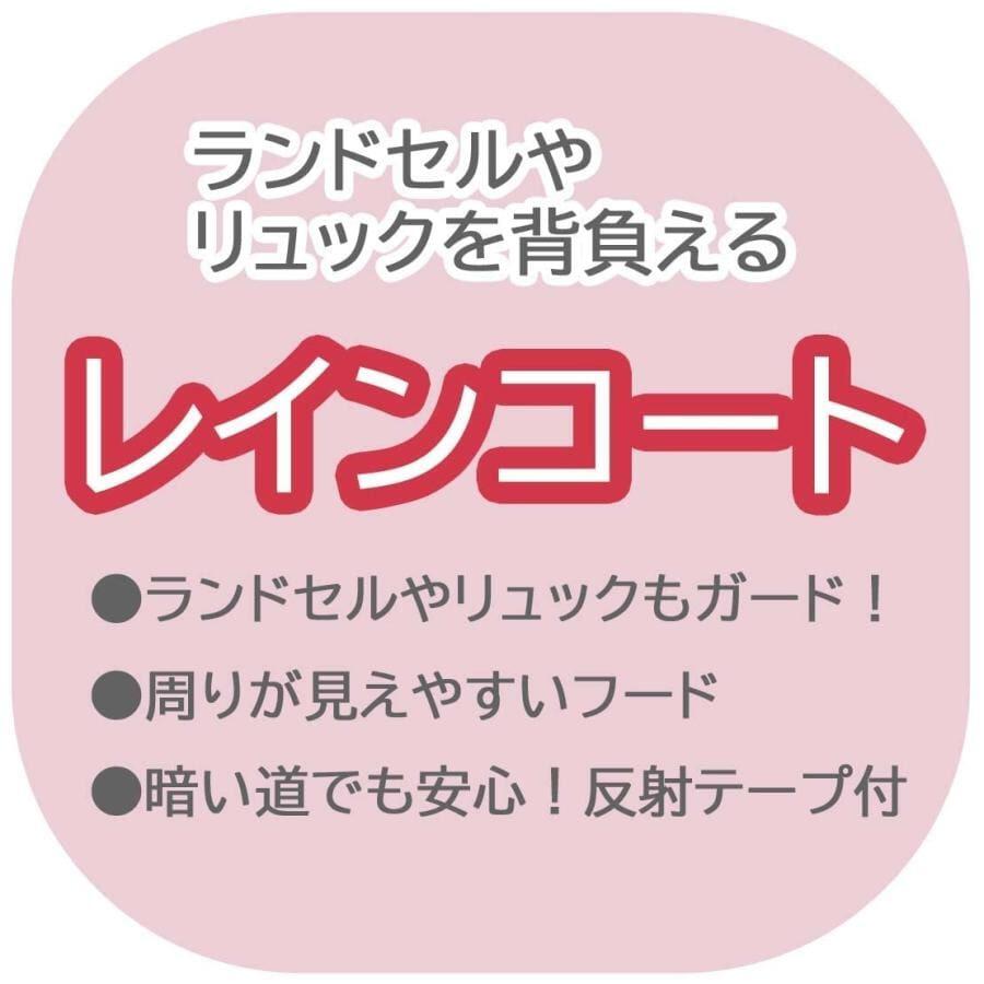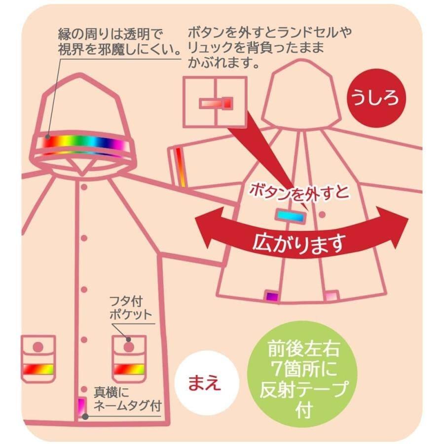 かわいい子供用レインコートで雨の日のお出かけも楽しく♪暗い道でも安心の反射テープが前後左右7か所についています。フードの顔周りは首元まで透明になっているので周りが見えやすく、左右の視界も邪魔しにくい!後ろのボタンを外すとランドセルやリュックを背負ったまま使えます。フタ付きのポケット、ネームタグ付き。【商品サイズ(約)】※適応身長:110~125cm<着丈>71cm【品質表示】本体・パイピング・反射テープ:ポリエステル フード:ポリエチレン