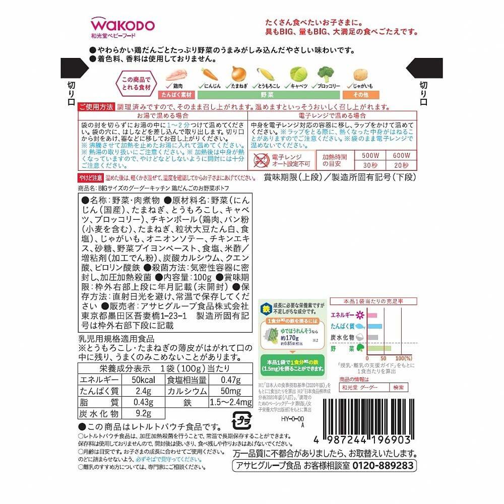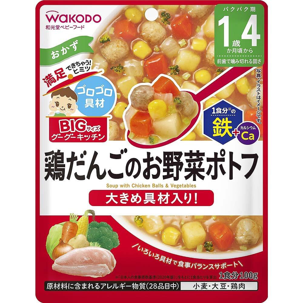 野菜(にんじん(国産)、たまねぎ、とうもろこし、キャベツ、ブロッコリー)、チキンボール(鶏肉、パン粉(小麦を含む)、たまねぎ、粒状大豆たん白、食塩)、じゃがいも、オニオンソテー、チキンエキス、砂糖、野菜ブイヨンペースト、食塩、米酢/増粘剤(加工でん粉)、炭酸カルシウム、クエン酸、ピロリン酸鉄