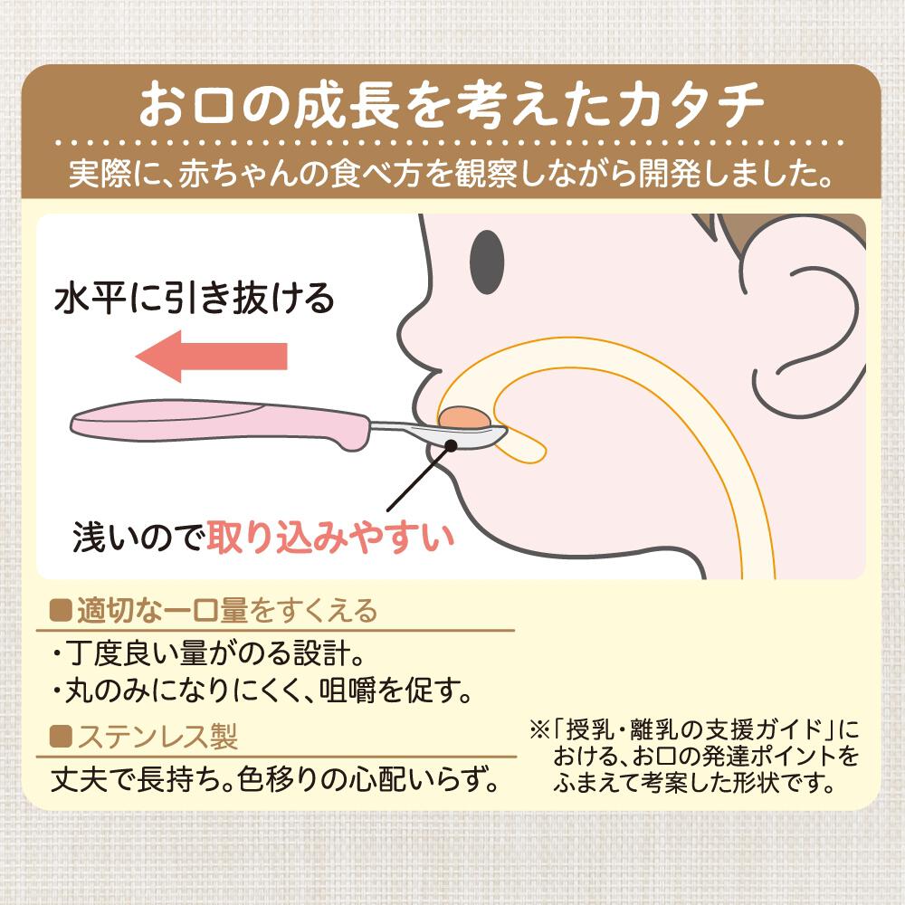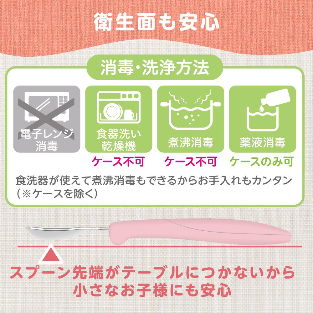 ※いずれか一つの発送となります。※種類はお選び頂けません。「自然ににぎれて、きちんと食べられる」スプーン&フォーク食具の扱いにまだ不慣れな赤ちゃんでも、最初の「にぎる」、そして「食材をすくう」動作が自然にしやすい工夫がいっぱい。無理なく、自然に食具に慣れ、自分で食べることが楽しくなります。「しっかり持てて、きちんと食べられる」●小さいお口にぴったりサイズ先端に食材が乗るから、唇で取り込みやすい。月齢にあった量がすくえるので、丸のみしにくく、咀嚼を促します。●手に馴染むから上手にすくえる左右どちらでも自然と手に馴染み、すくいやすいアーチ形状。様々な持ち手に対応でき、長く使えます。波型フォークだから、つるつるした麺類もしっかりキャッチ。●ステンレス製で長持ち丈夫で長持ち。色移りの心配もありません。●衛生面にも配慮スプーン先端がテーブルにつかないよう工夫しました。小さなお子様にも安心して使えます。★保管ケース付きだから持ち運びにも便利