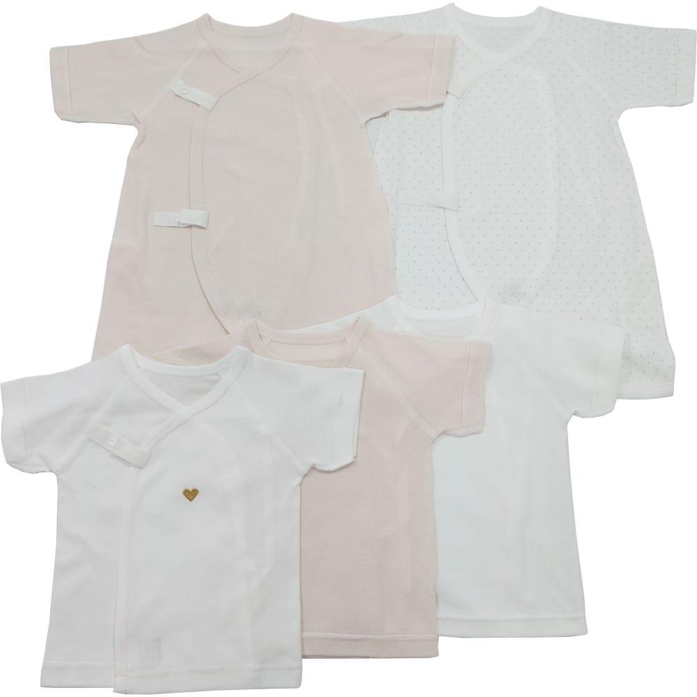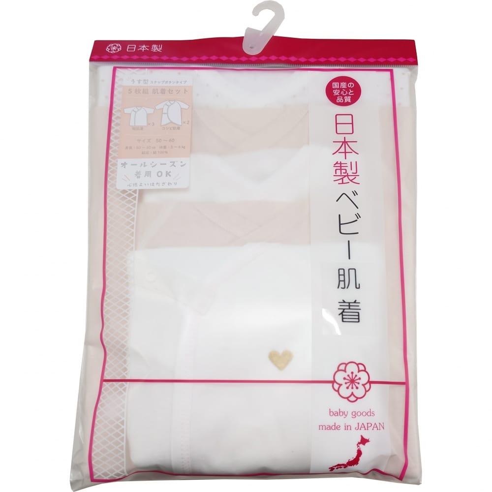 育児を楽にするスナップボタン肌着です。肌着の外側のスナップボタンを留め合わせるだけで簡単に着せることが出来ます。ボタン部分は従来のプラスチックボタンの1/2の薄さ(※当社比)になり、肌あたりが優しいことも特徴です。肌着の内側は赤ちゃんの成長に合わせて微調整できるよう、ヒモ結び仕様です。生地作りから縫製まですべて日本国内で生産。吸水性に優れたやわらかな綿100%フライス生地を使用しています。新生児期の敏感なお肌にも安心してご使用いただけます。縫い目を外側にした、赤ちゃんのお肌に優しい『外縫い』仕様です。短肌着は体にフィットし、汗をしっかり吸収します。コンビ肌着は足元にスナップボタンが付いているので、裾がはだけにくく、赤ちゃんを優しく包み込みます。出産準備にもおすすめの肌着セットです。<内容>短肌着3枚、コンビ肌着2枚<サイズ>50-60cm(新生児~3ヶ月用)<素材>フライス<組成>綿100%<セット内容>短肌着3枚、コンビ肌着2枚<主な材質>フライス 綿100%