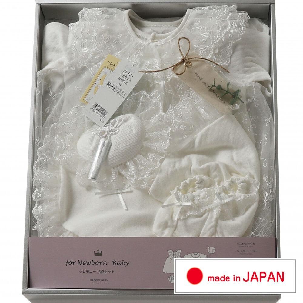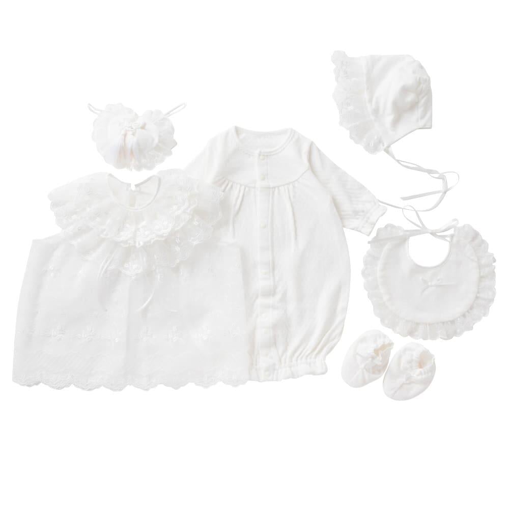 退院やお宮参りに最適なドレス、チュールコート、フード、スタイ、ファーストシューズ・お守り入れ袋の6点セットです。