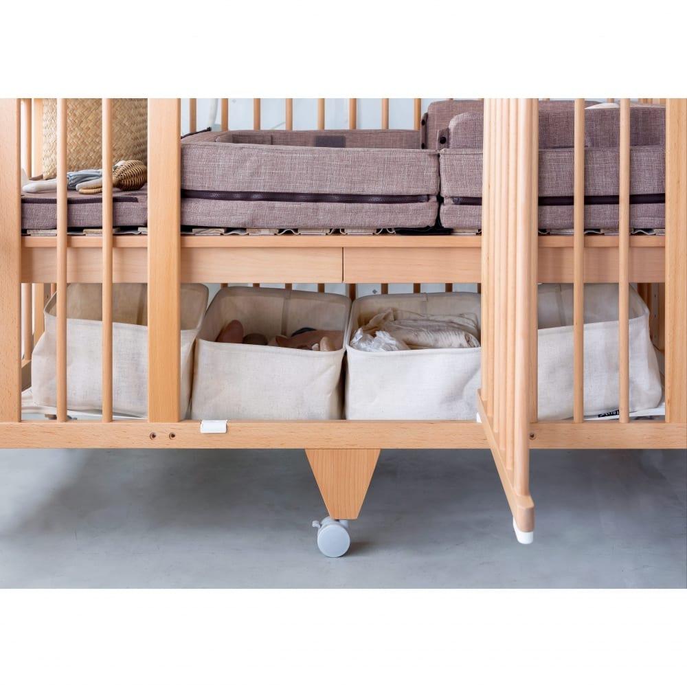 ・オプション品の利用で、荷物入れもベビーベッドの下に設けることが可能です。5in1機能以外にも、オプションパーツを利用することによって ベビーゲートやプレイルームにも変身し、成長とともにカタチを変えながらお楽しみいただけます。
