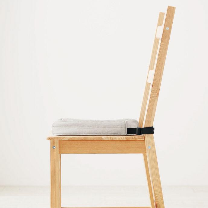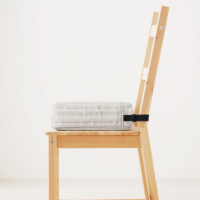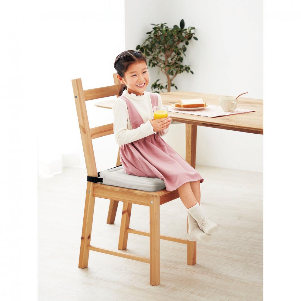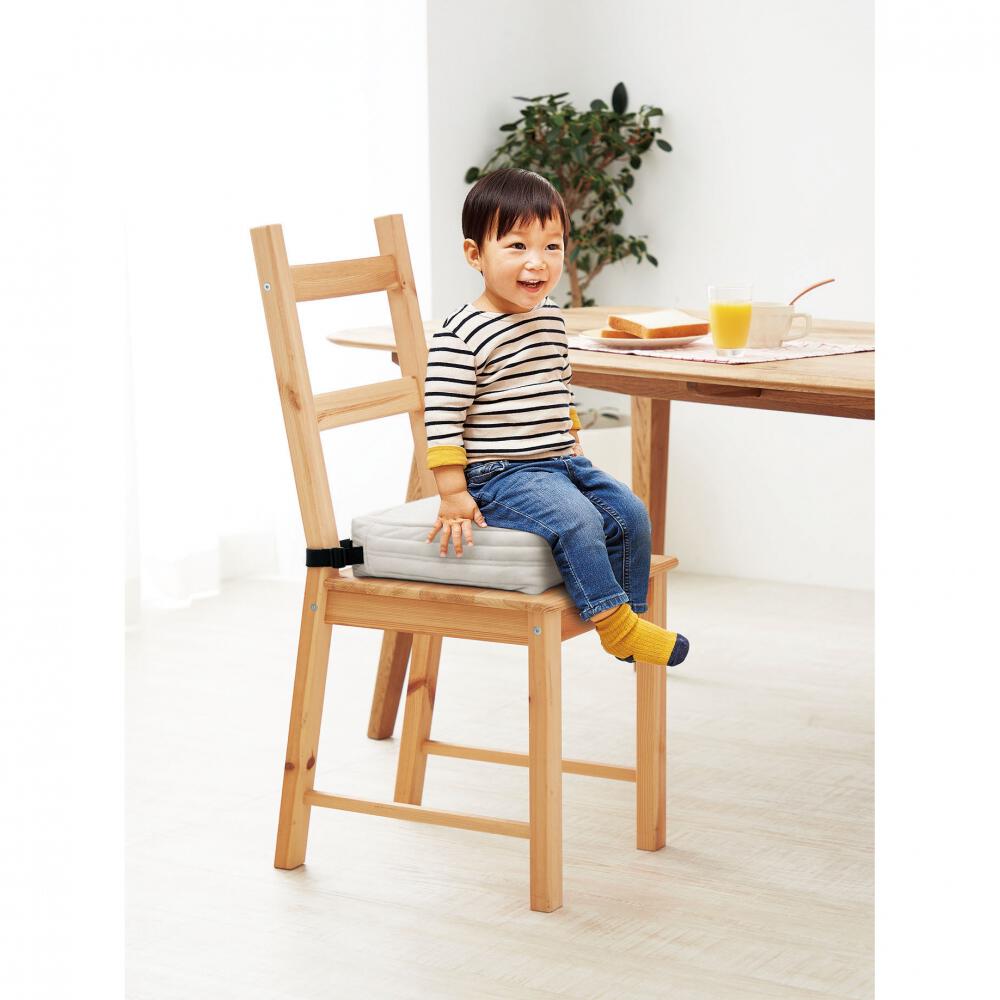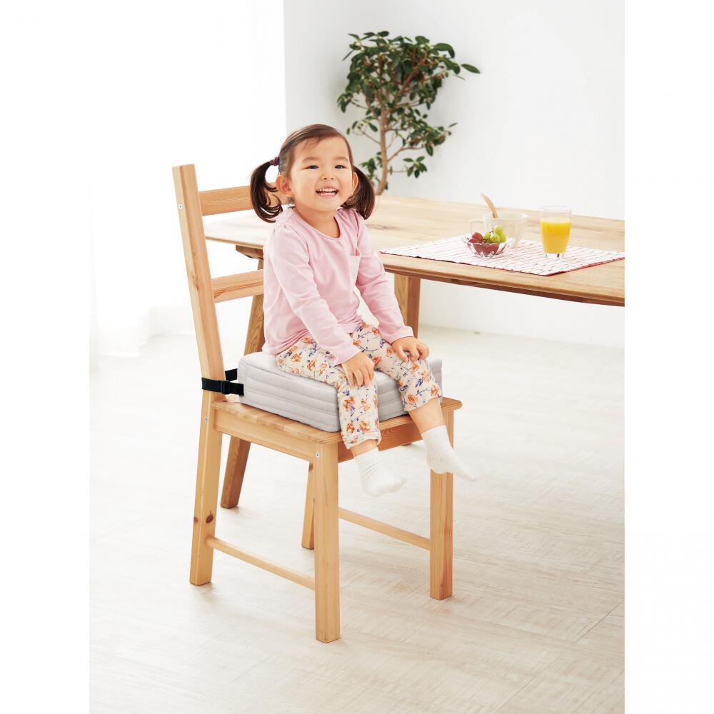 大人と一緒の椅子で楽しくお食事できます。イブルの優しい肌触り。クッションの中材を取り出すことで高さが3段階に調節できるので、成長に合わせて使用する事ができます。長さ調節できるベルトで、椅子に固定することも出来ます。