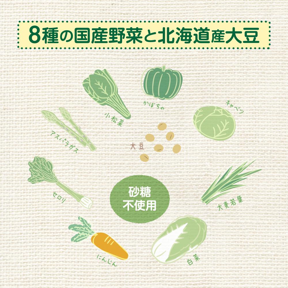 ⇒主原材料の大豆は北海道産、8種類の野菜パウダーも国産原料です。