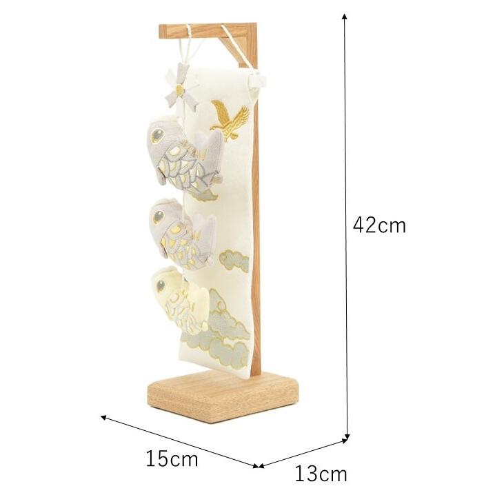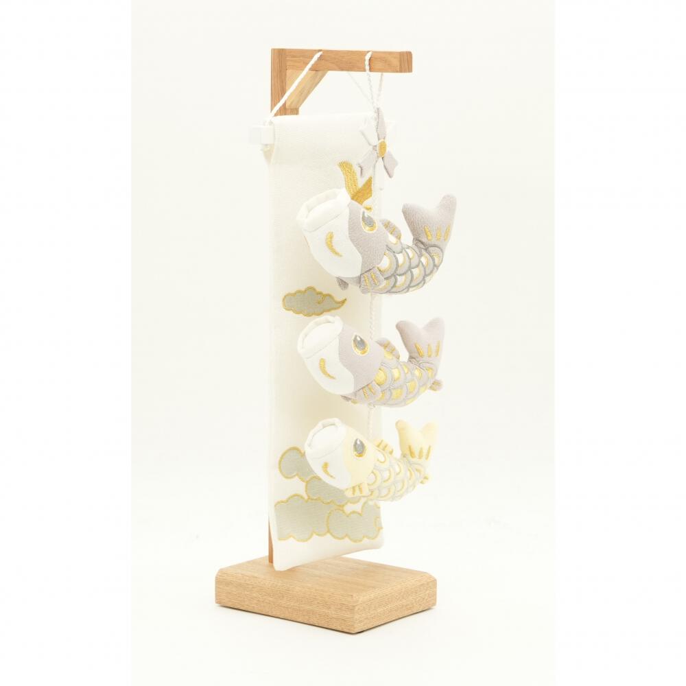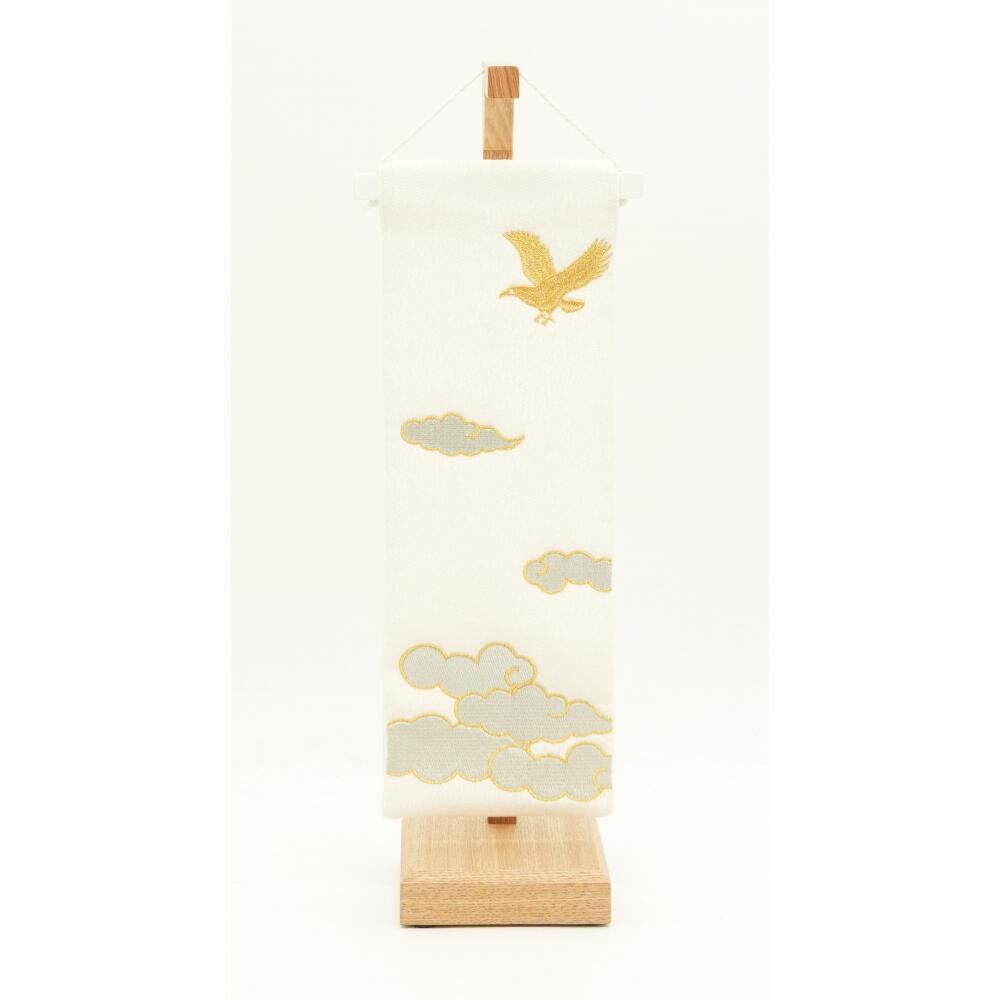 鷹と雲の刺繍を施したタペストリーが付いた、淡い色合いの可愛らしいぬいぐるみの室内鯉のぼりです。ナチュラルなインテリアのお部屋や洋室にもおすすめのホワイト基調のカラーです。