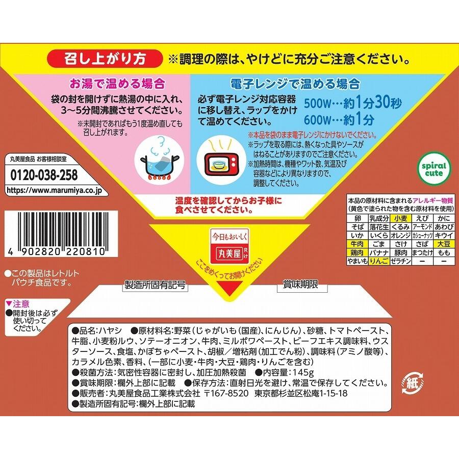 ※いずれか一つの発送となります。※種類はお選び頂けません。小さなお子さまにも食べさせやすい容量です。マイルドな味付けで小さなお子様もおいしく食べられます。5種の野菜入りです。※下記いずれか一つの発送となります。※種類はお選び頂けません。ポケモン ハヤシ●品名:ハヤシ●原材料名:野菜(じゃがいも(国産)、にんじん)、砂糖、トマトペースト、牛脂、小麦粉ルウ、ソテーオニオン、牛肉、ミルポワペースト、ビーフエキス調味料、ウスターソース、食塩、かばちゃペースト、胡椒/増粘剤(加工でん紛)、調味料(アミノ酸等)、カラメル色素、香料、(一部に小麦・牛肉・大豆・鶏肉・りんごを含む)●栄養成分表示 製品1人前(145g)あたり エネルギー 120Kcal、たんぱく質 2.3g、脂質 4.8g、炭水化物 17g、食塩相当量 2.1g この表示値は目安です。●殺菌方法:気密性容器に密封し、加圧加熱殺菌●内容量:145g●保存方法:直射日光を避け、常温で保存してください。●販売者:丸美屋食品工業株式会社 〒167-8520 東京都杉並区松庵1-15-18ちいかわ ハヤシ●品名:ハヤシ●原材料名:野菜(じゃがいも(国産)、にんじん)、砂糖、トマトペースト、牛脂、小麦粉ルウ、ソテーオニオン、牛肉、ミルポワペースト、ビーフエキス調味料、ウスターソース、食塩、かばちゃペースト、胡椒/増粘剤(加工でん紛)、調味料(アミノ酸等)、カラメル色素、香料、(一部に小麦・牛肉・大豆・鶏肉・りんごを含む)●栄養成分表示 製品1人前(145g)あたり エネルギー 120Kcal、たんぱく質 2.3g、脂質 4.8g、炭水化物 17g、食塩相当量 2.1g この表示値は目安です●殺菌方法:気密性容器に密封し、加圧加熱殺菌●内容量:145g●保存方法:直射日光を避け、常温で保存してください。●販売者:丸美屋食品工業株式会社 〒167-8520 東京都杉並区松庵1-15-18※出荷時点で賞味期限まで30日以上の商品を出荷いたします。※賞味期限が長い商品とのご交換や、賞味期限理由による返品はいたしかねます。予めご了承ください。