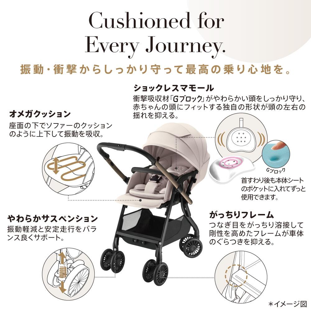 振動吸収材「Gブロック」がやわらかい頭をしっかり守り、赤ちゃんの頭にフィットする独自の形状が頭の左右の揺れを抑えます。