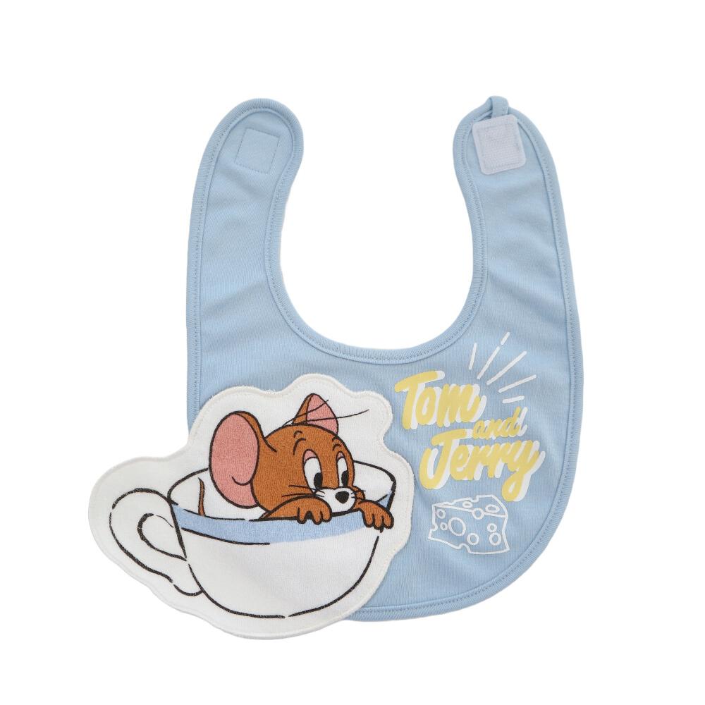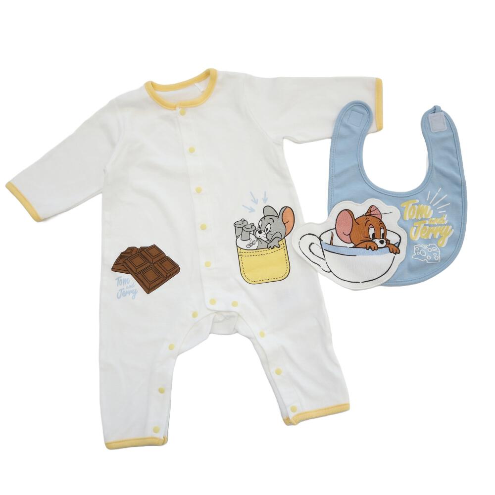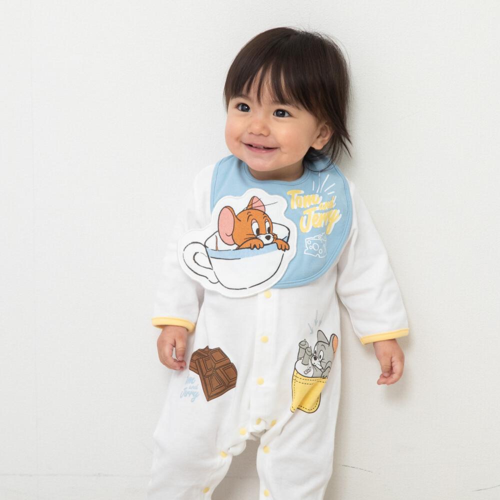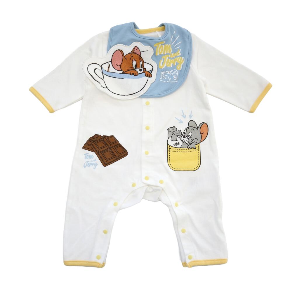 人気キャラクター、トム&ジェリーのスタイ付き長袖ロンパースです。