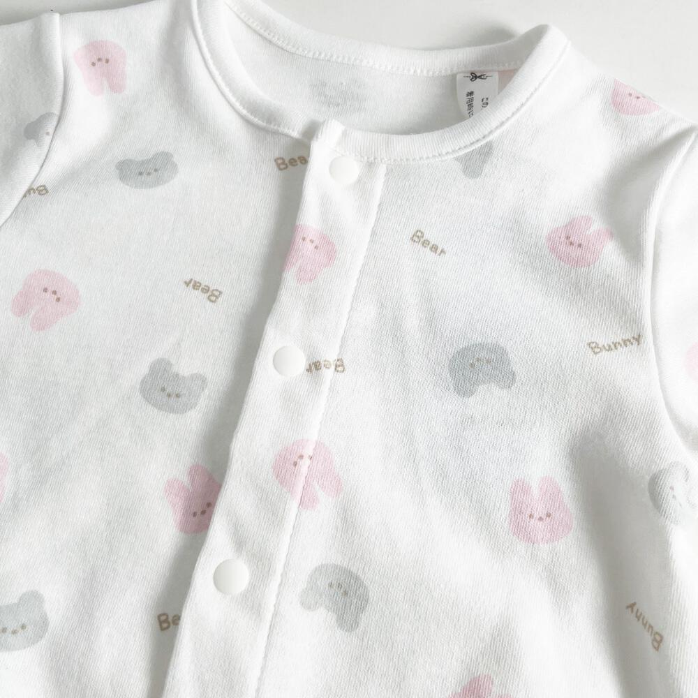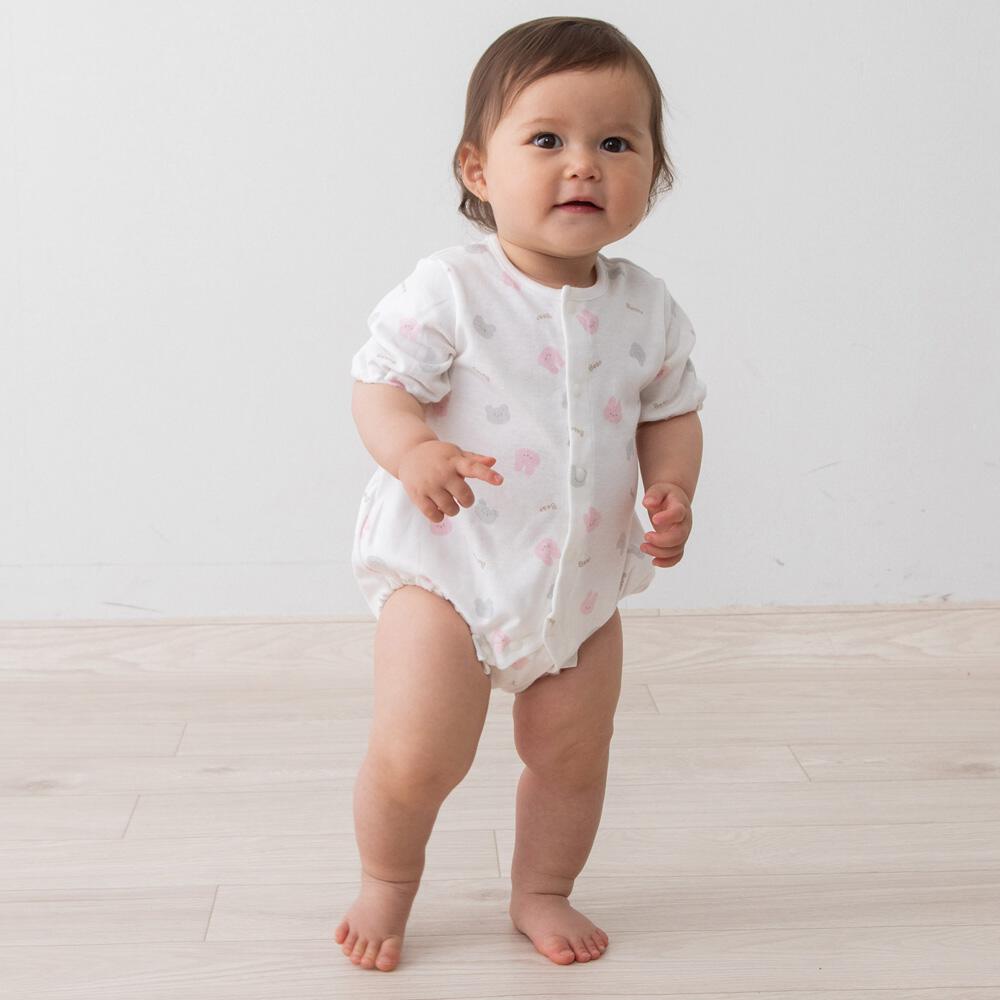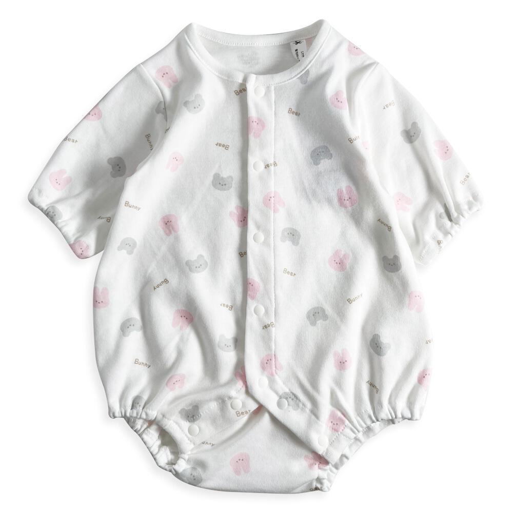 日本製 7分袖ロンパス スムス くまうさ柄 ナチュラル×60-70cm