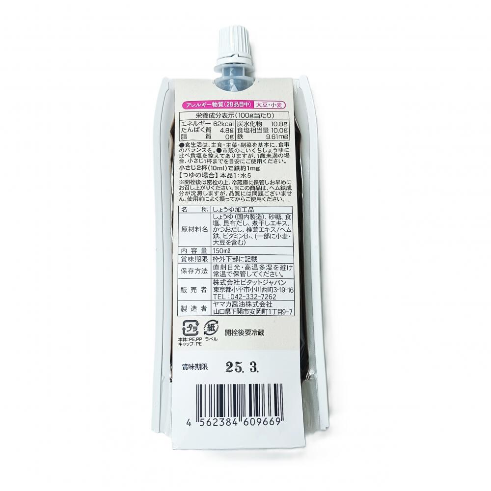 原材料名:しょうゆ(国内製造)、砂糖、食塩、昆布だし、煮干しエキス、かつおだし、椎茸エキス/ヘム鉄、ビタミンB1、一部に小麦・大豆を含む)