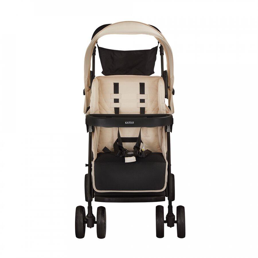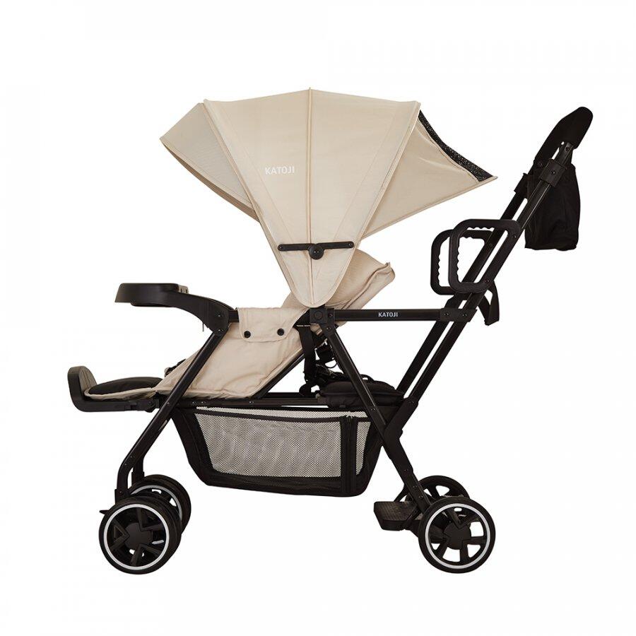 上のお子様を後部座席に、下のお子様を前部座席に乗せることのできる二人乗りベビーカー。