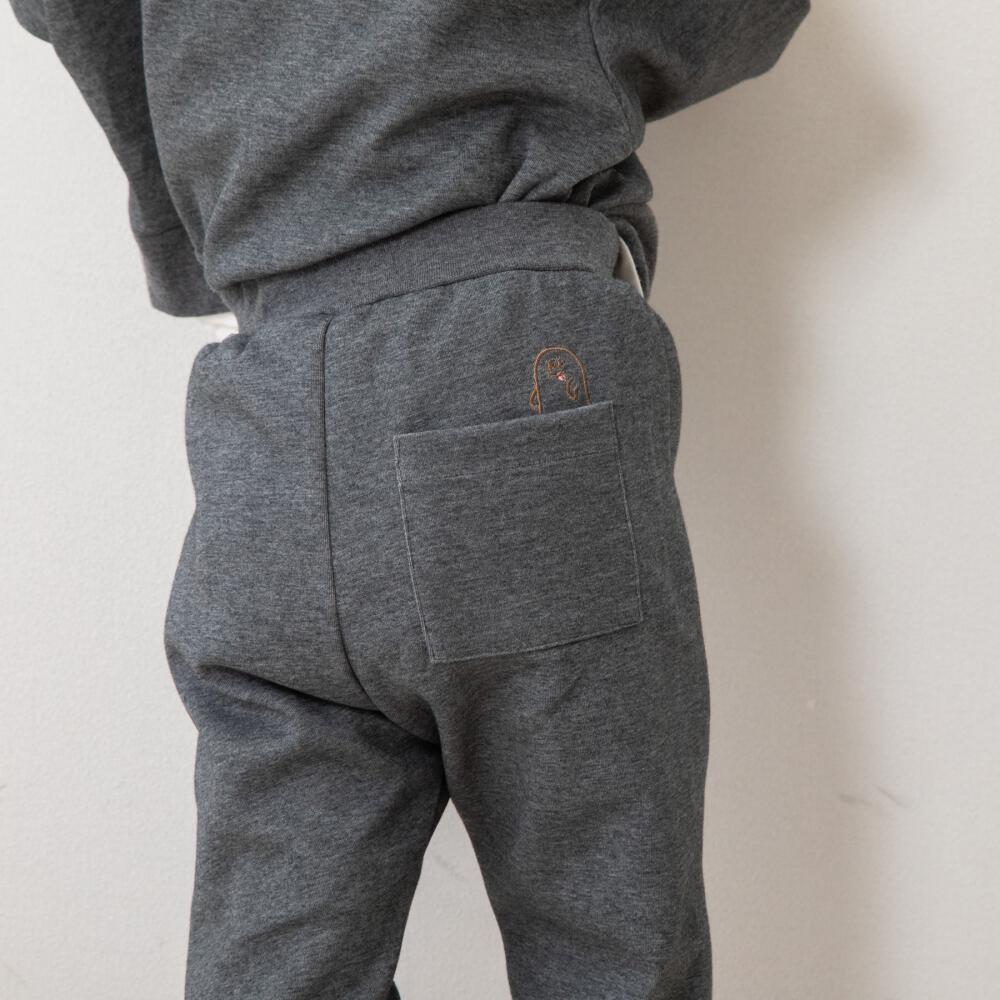 ウエスト総ゴム仕様、裾口リブ、後ろポケット、ワンポイント刺繍入り