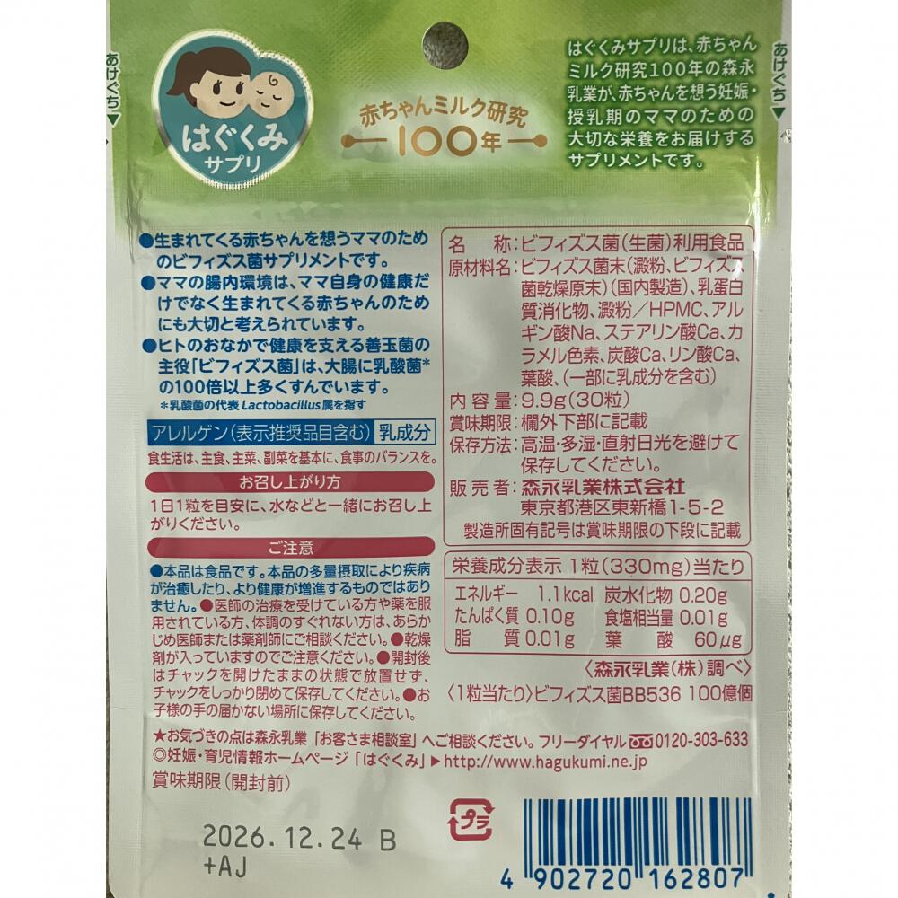 ママにも赤ちゃんにも大切な生きたビフィズス菌BB536を100億個と葉酸(60マイクログラム)を1粒にギュッと配合したサプリメントです。