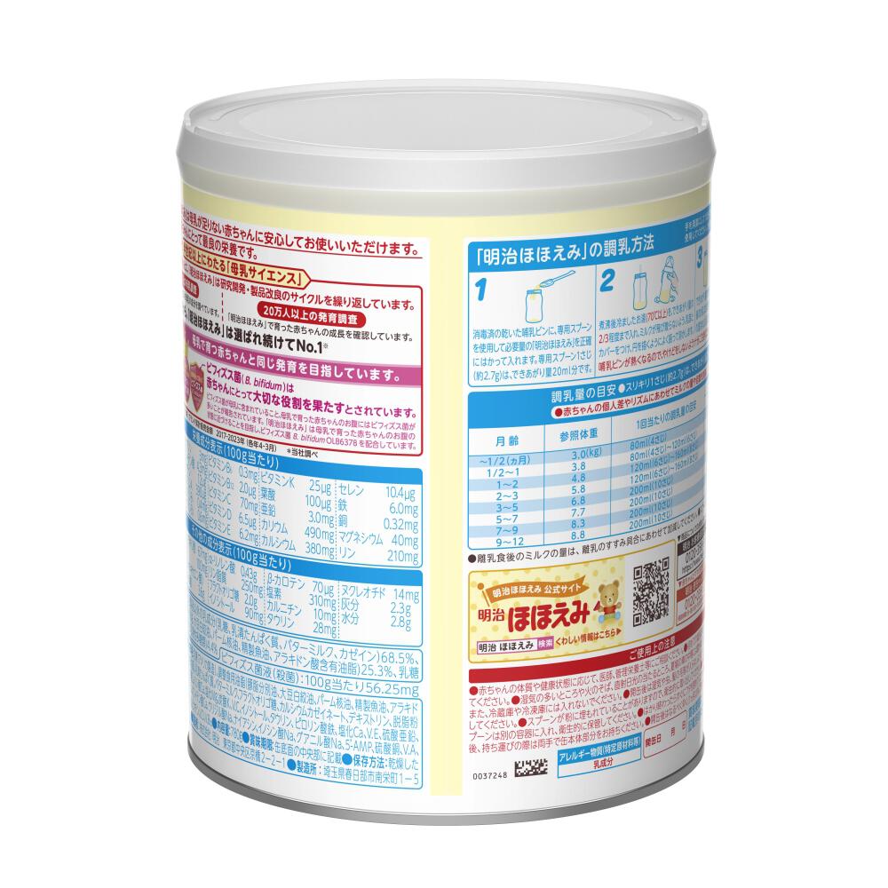 <原材料> 乳糖(アメリカ製造)、調整食用油脂(豚脂分別油、大豆白絞油、パーム核油、精製魚油、アラキドン酸含有油脂)、乳清たんぱく質、バターミルク、フラクトオリゴ糖、カルシウムカゼイネート、デキストリン、脱脂粉乳、食塩、ビフィズス菌液、酵母/炭酸Ca、リン酸Ca、塩化Mg、炭酸K、V.C、イノシトール、タウリン、ピロリン酸鉄、塩化Ca、V.E、硫酸亜鉛、塩化K、シチジル酸Na、L-カルニチン、パントテン酸Ca、ウリジル酸Na、ナイアシン、イノシン酸Na、グアニル酸Na、5'-AMP、硫酸銅、V.A、V.B1、V.B2、V.B6、カロテン、葉酸、V.K、ビオチン、V.D、V.B12