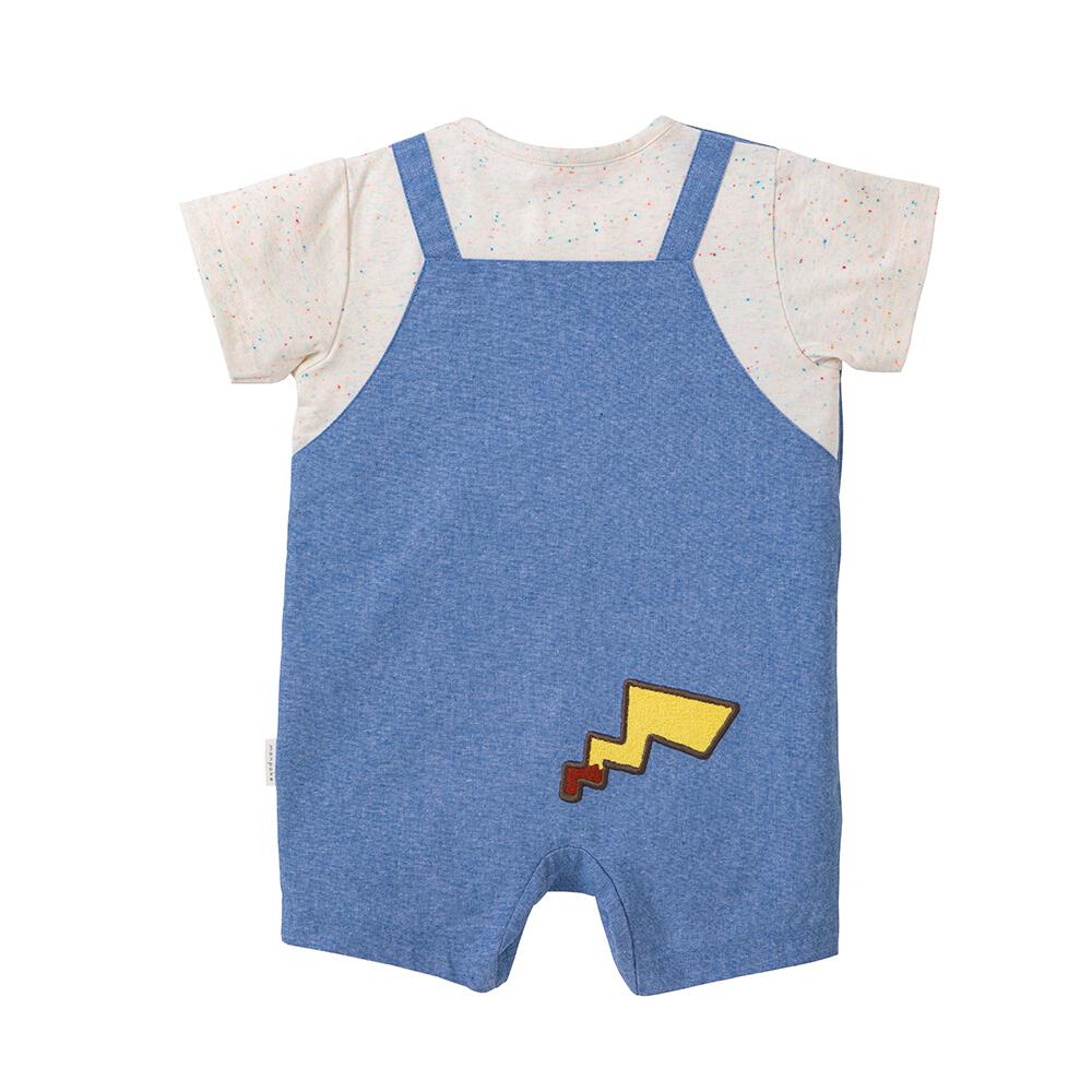 サロペット風の半袖ロンパース。涼しげなシャンブレー生地を使用しています。