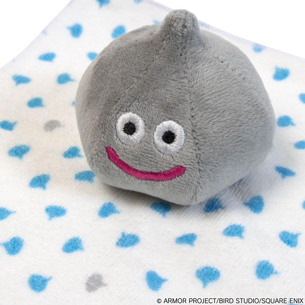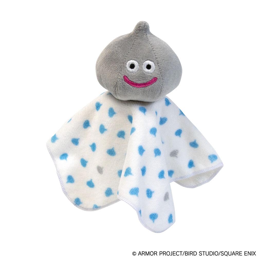 スライム/メタルスライムのぬいぐるみが付いた、赤ちゃんの手にぴったりのにぎにぎタオル。