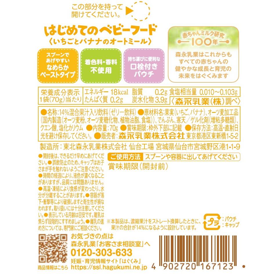 <原材料> 果実(いちご、バナナ)、オーツ麦加工品(国内製造(オーツ麦粉、オーツ麦糖化物、植物油脂、食塩))、でんぷん、寒天/ゲル化剤(増粘多糖類)、クエン酸、塩化カリウム