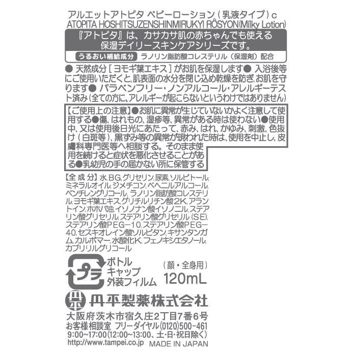 アトピタベビーローション(乳液タイプ)は、お肌のカサつきトラブルをうるおいバリアでお肌を守る商品です。お肌を保湿・保護する「LFC(ラノリン脂肪酸コレステリル)」配合しているので、水分をたくわえ蒸散を防ぎカサカサ肌をしっとりとさせます。また、保湿成分「ヨモギエキス」と「尿素」配合しているので更にお肌をしっとりとさせます。べたつかず、お肌をしっとり整える商品です。