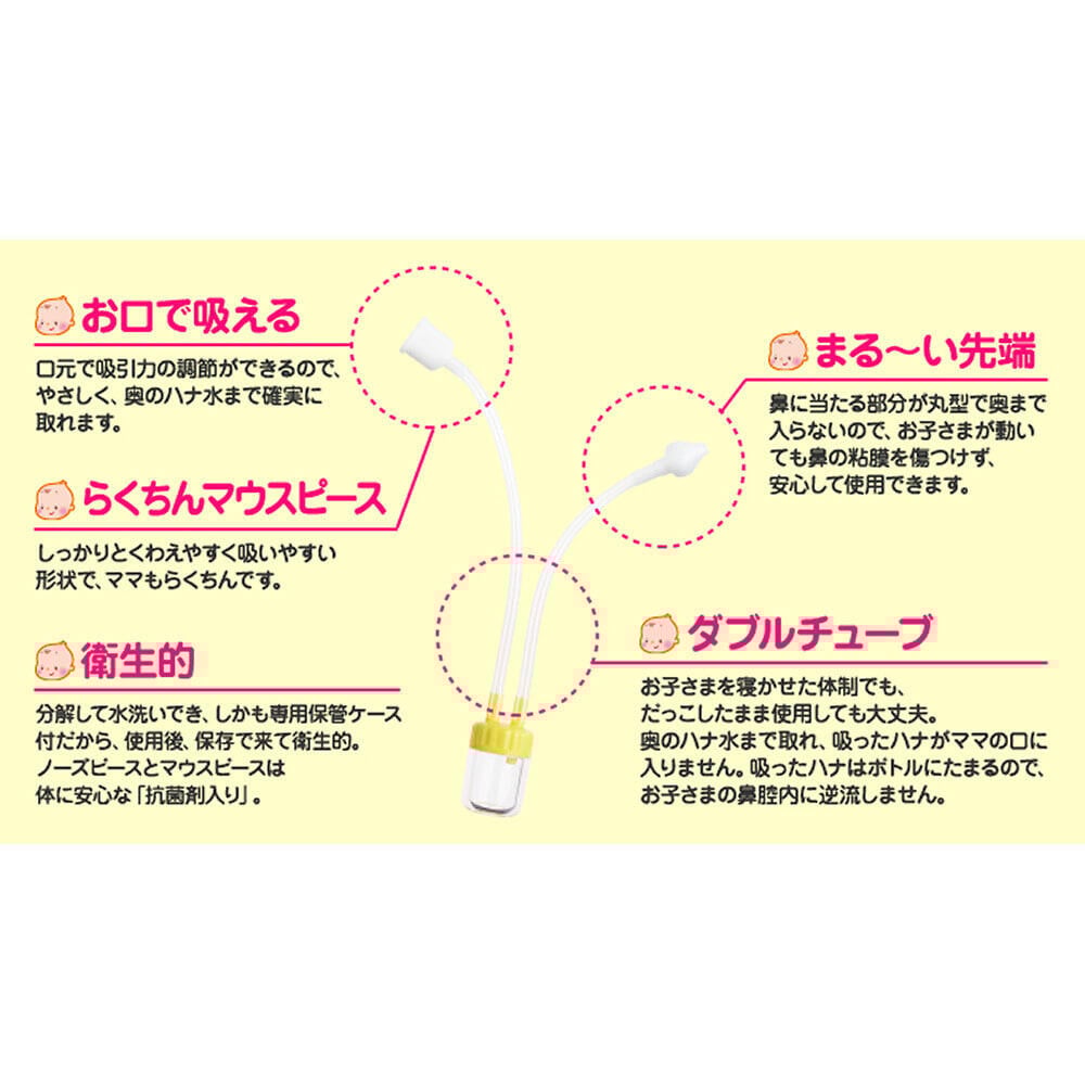 ダブルチューブなので、お子様を寝かせた姿勢でも、だっこしたまま使用しても吸ったハナは中間ボトルにたまるので、吸ったハナがママの口に入らず、お子様の鼻腔内に逆流しません。