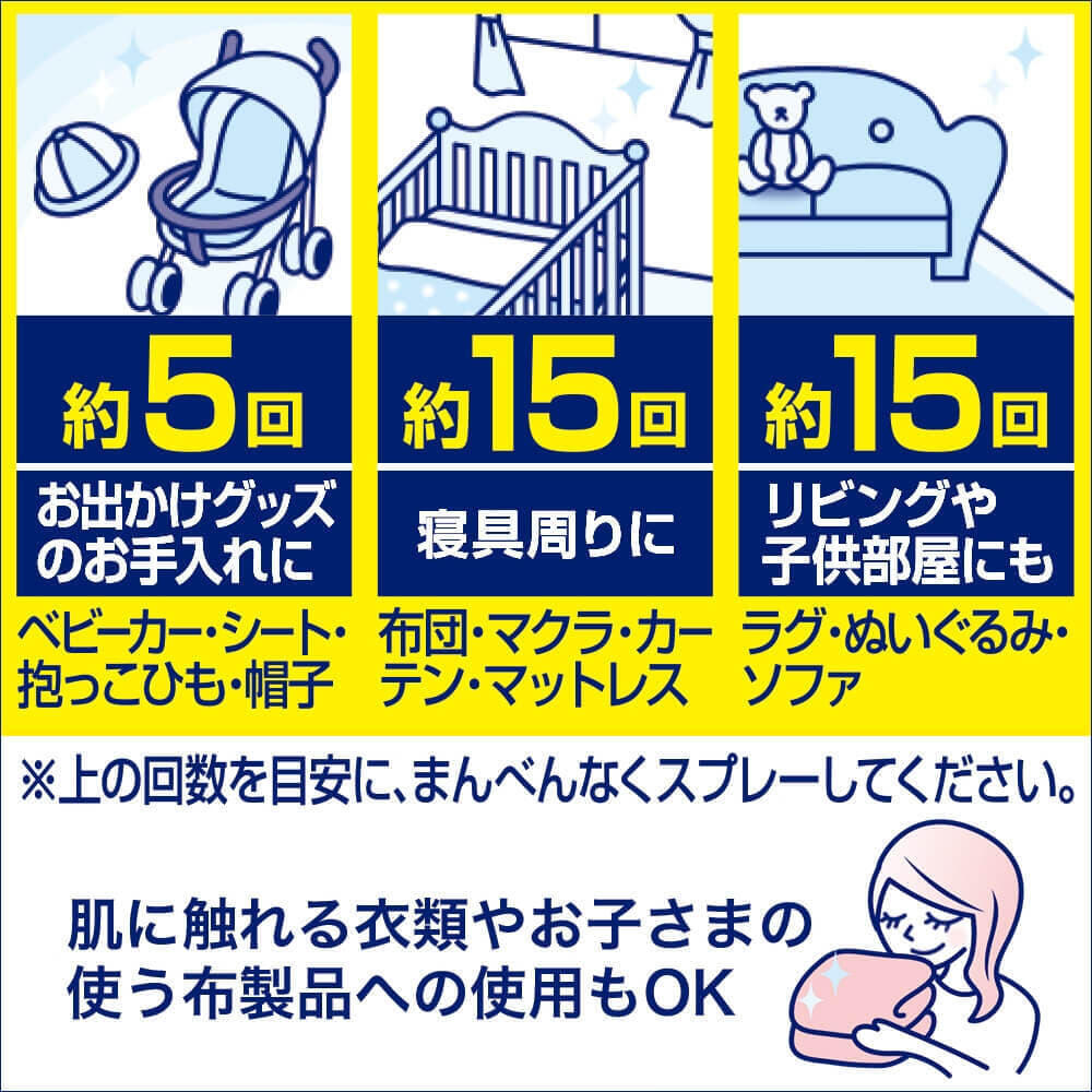 ●ベビーカーやベビーベッド、チャイルドシートやぬいぐるみなど洗えなくて困っていたアイテムも除菌できます。