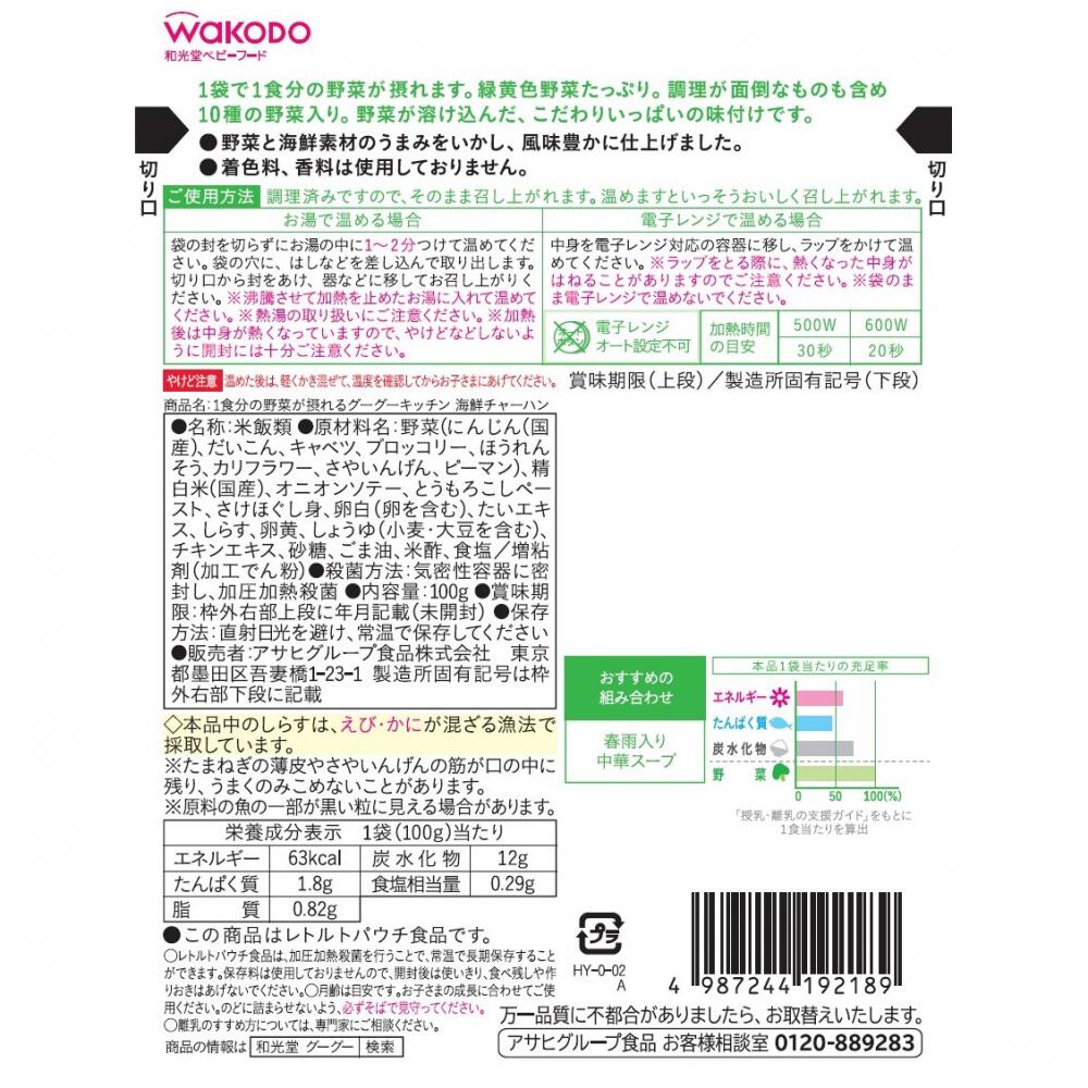 野菜(にんじん(国産)、だいこん、キャベツ、ブロッコリー、ほうれんそう、カリフラワー、さやいんげん、ピーマン)、精白米(国産)、オニオンソテー、とうもろこしペースト、さけほぐし身、卵白(卵を含む)、たいエキス、しらす、卵黄、しょうゆ(小麦・大豆を含む)、チキンエキス、砂糖、ごま油、米酢、食塩/増粘剤(加工でん粉)