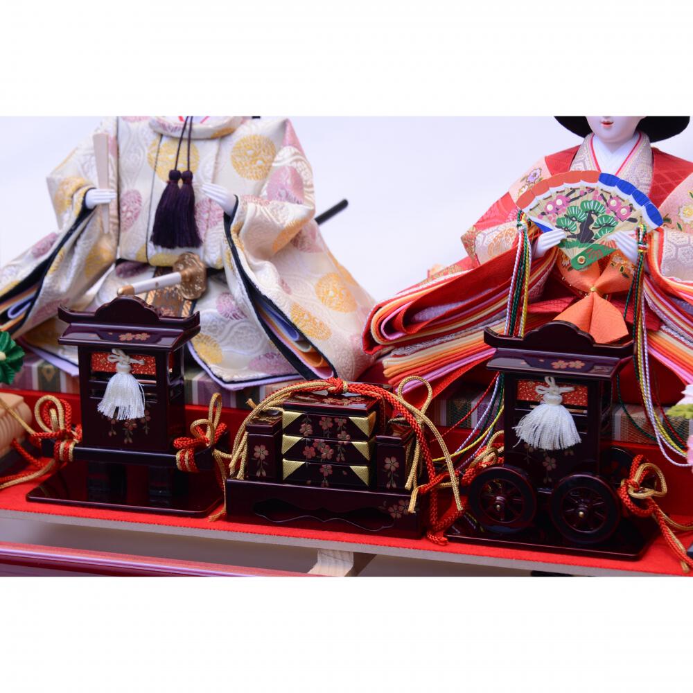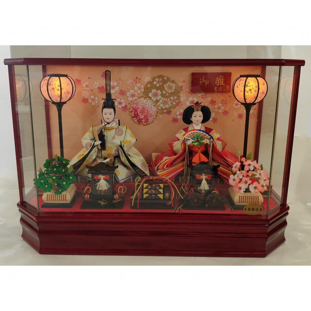 <セット内容>人形(2人)一式、ガラスケース1点、雪洞1対、桜橘1点、道具3点、親王台1対、木札1点