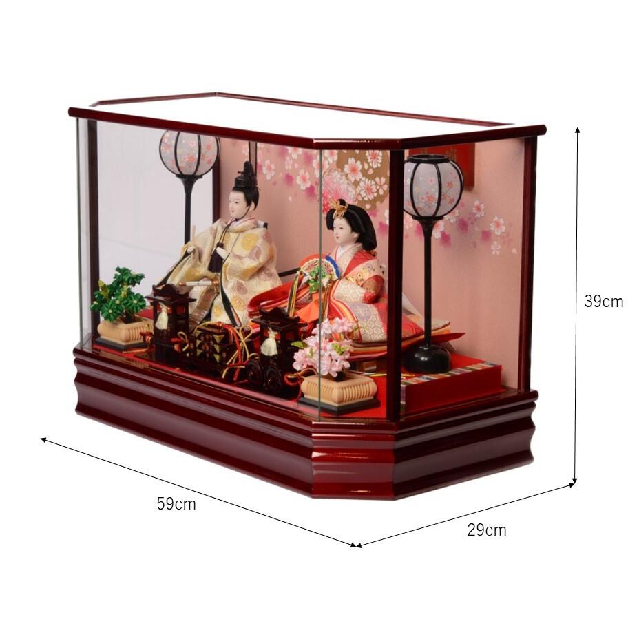高級感のあるワイン塗のガラスケース飾りです。ケースは正面に柱のない六角形のパノラマタイプです。背景にはほんのりとしたピンク色が可愛らしい雪輪桜を描きました。本商品は人形等がケースに固定され、梱包されていますので、梱包箱から出すだけで飾って頂けます。
