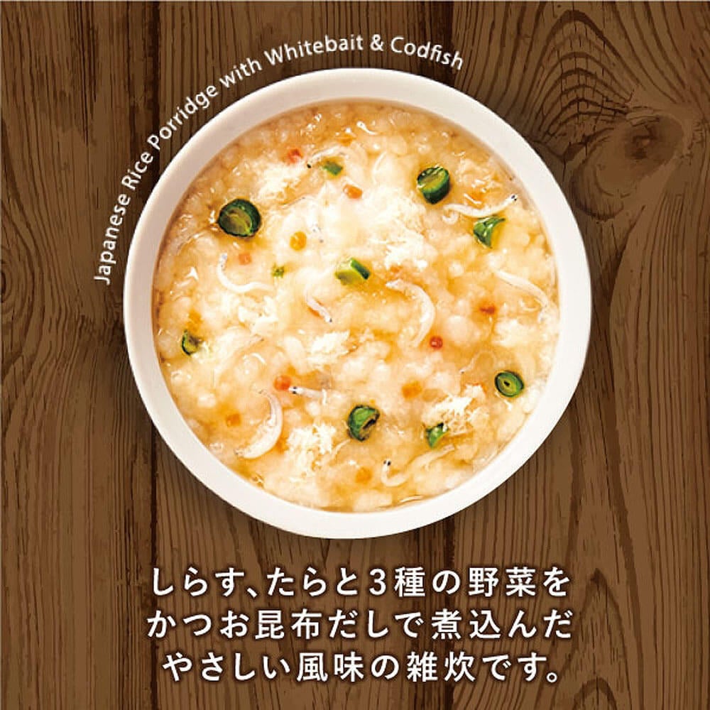 釜揚げしらす、たらと3種の野菜をかつお昆布だしで煮込んだ、やさしい風味の雑炊です。