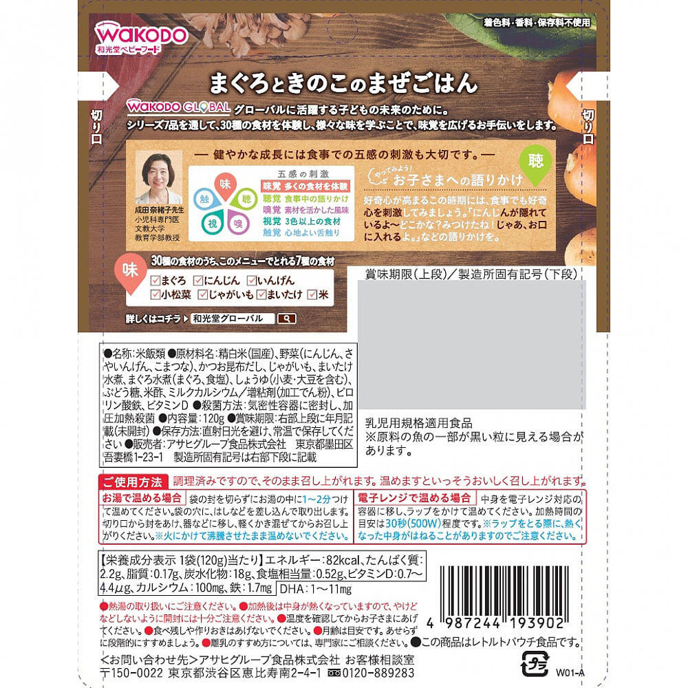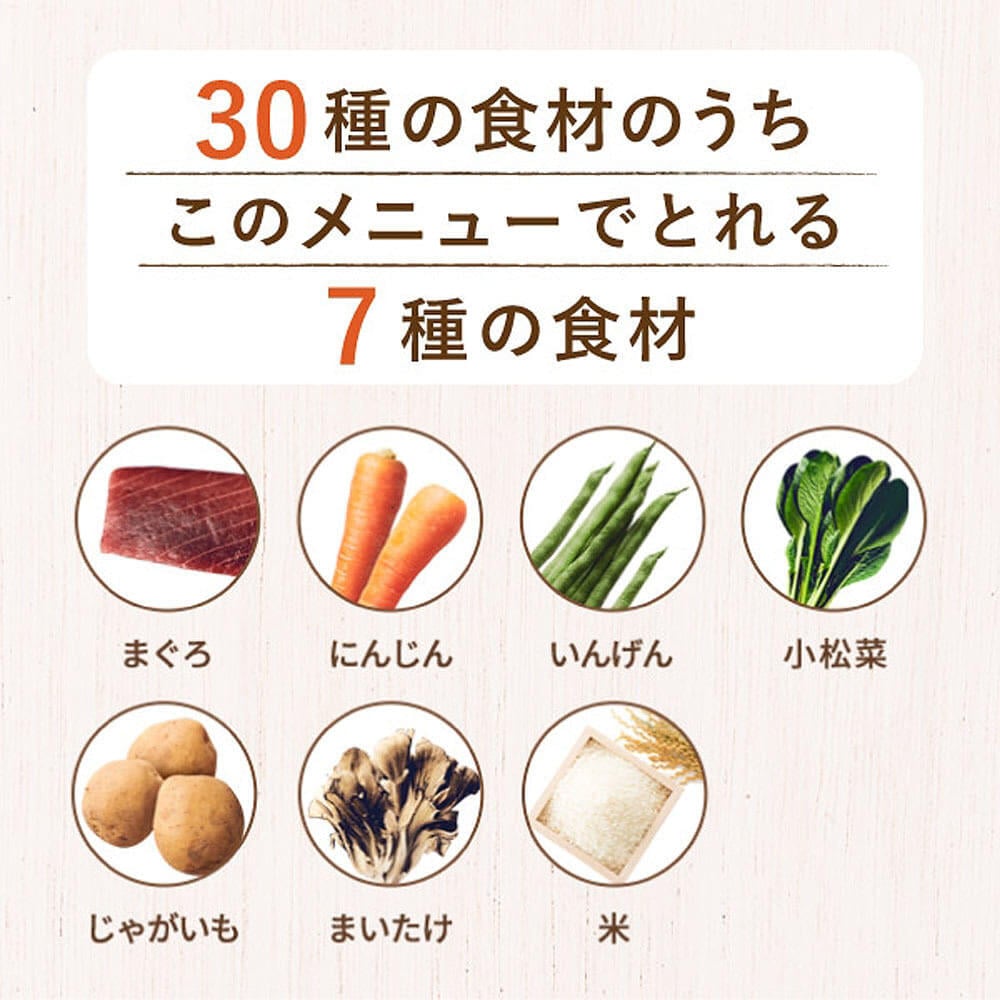 精白米(国産)、野菜(にんじん、さやいんげん、こまつな)、かつお昆布だし、じゃがいも、まいたけ水煮、まぐろ水煮(まぐろ、食塩)、しょうゆ(小麦・大豆を含む)、ぶどう糖、米酢、ミルクカルシウム/増粘剤(加工でん粉)、ピロリン酸鉄、ビタミンD