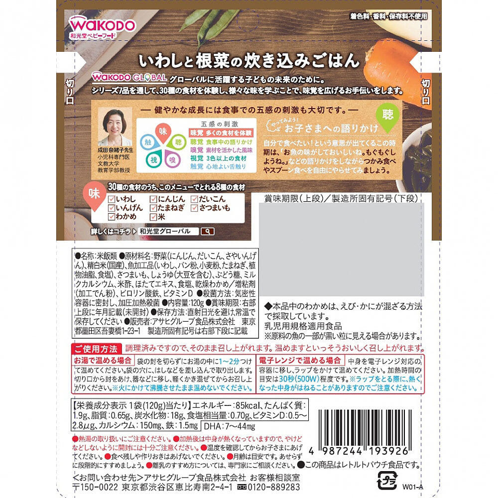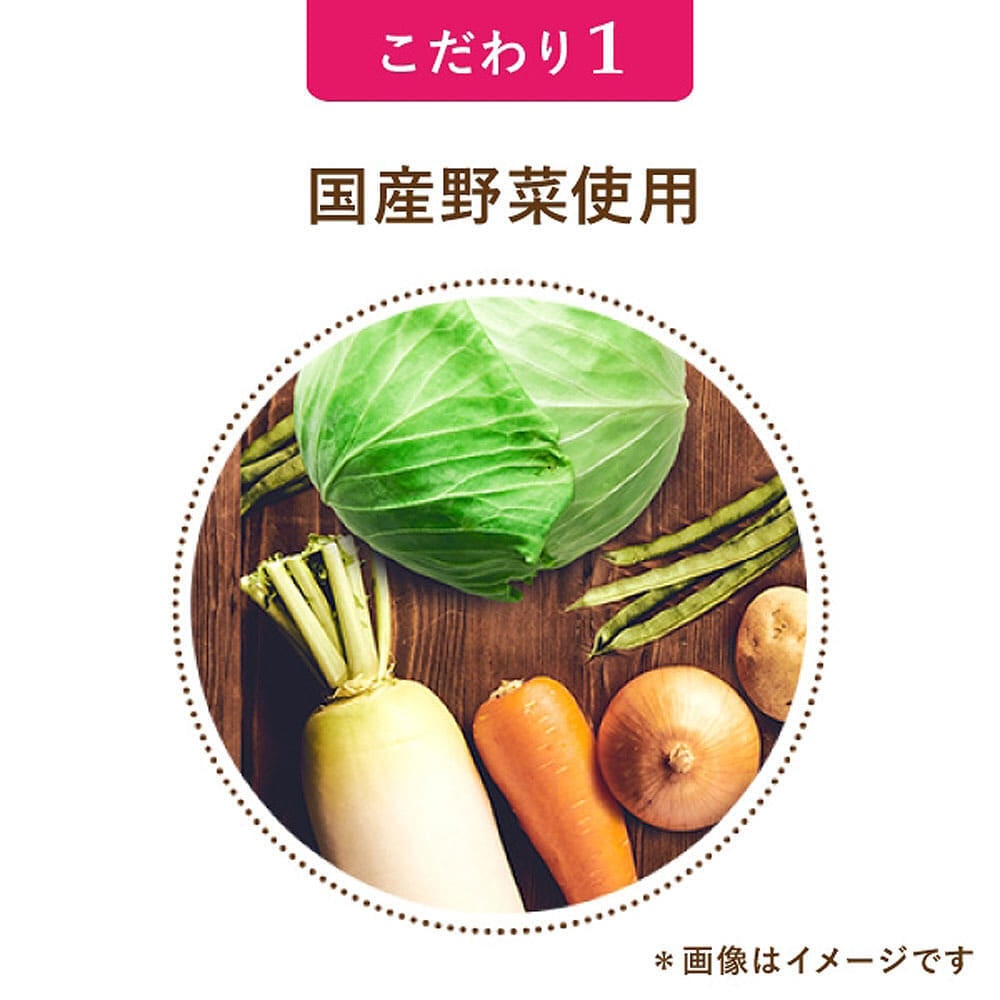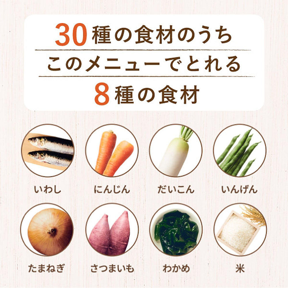 野菜(にんじん、だいこん、さやいんげん)、精白米(国産)、魚加工品(いわし、パン粉、小麦粉、たまねぎ、植物油脂、食塩)、さつまいも、しょうゆ(大豆を含む)、ぶどう糖、ミルクカルシウム、米酢、ほたてエキス、食塩、乾燥わかめ/増粘剤(加工でん粉)、ピロリン酸鉄、ビタミンD
